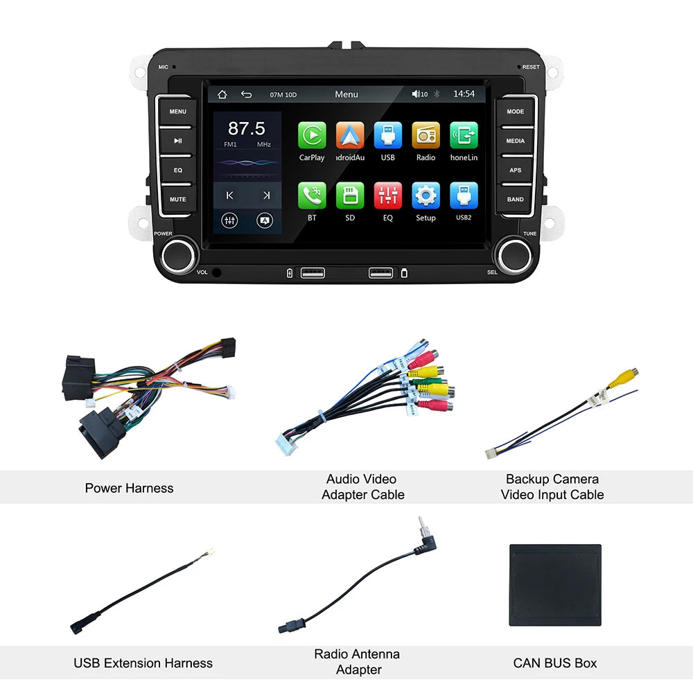 - 1 x 7-дюймовый автомобильный стереоаппарат, совместимый с VW, с встроенным CarPlay/Android Auto