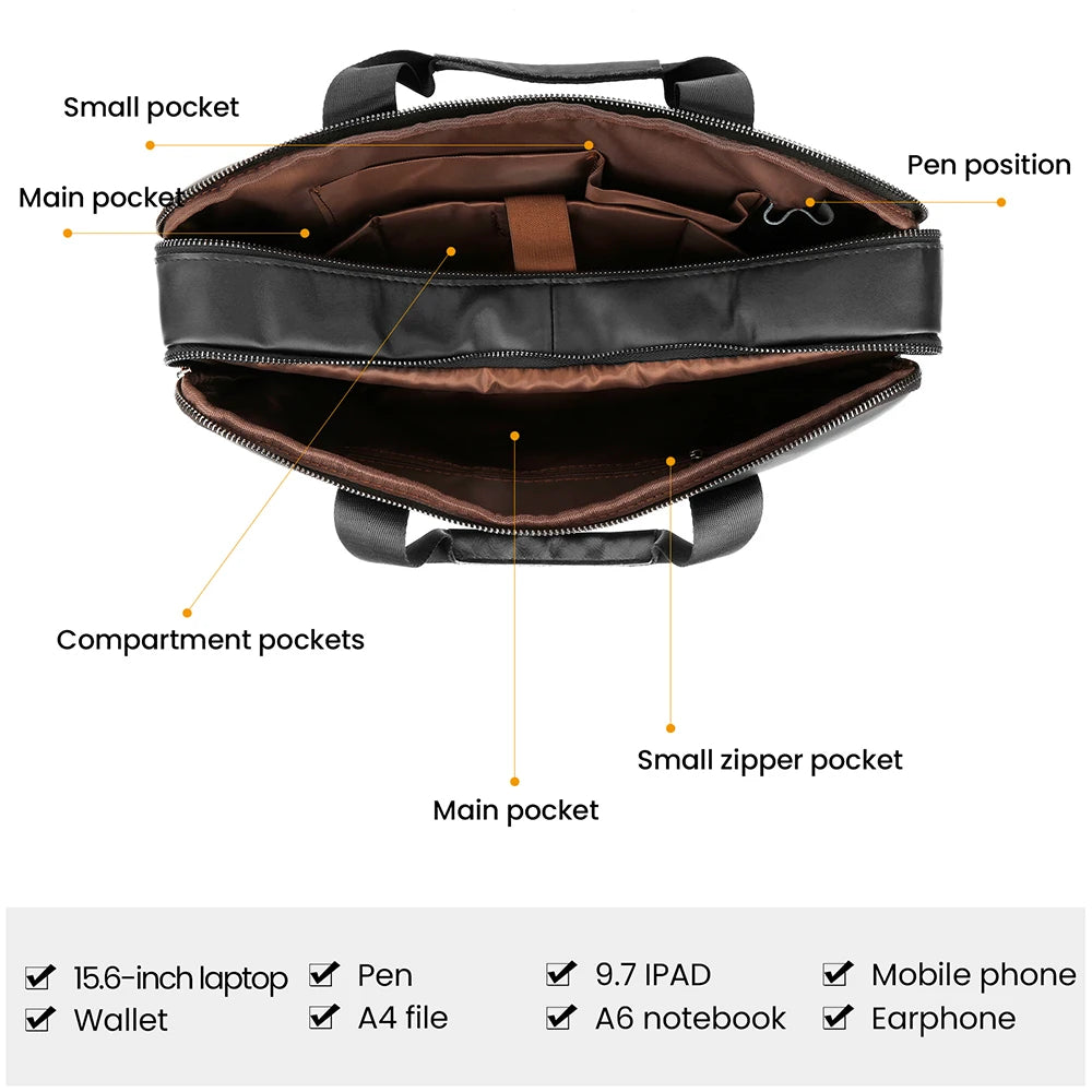 Представляем портфель для ноутбука JOYIR из натуральной кожи размером 15,6 дюйма для мужчин — премиальное сочетание прочной надежности и вечного стиля. Изготовленный из натуральной коровьей кожи, этот портфель обеспечивает профессиональный внешний вид с повседневной практичностью. Он подходит для ноутбуков до 15,6 дюймов и надежно защищает ваше устройство с помощью прочной застежки-молнии и специального внутреннего слоя для компьютера.