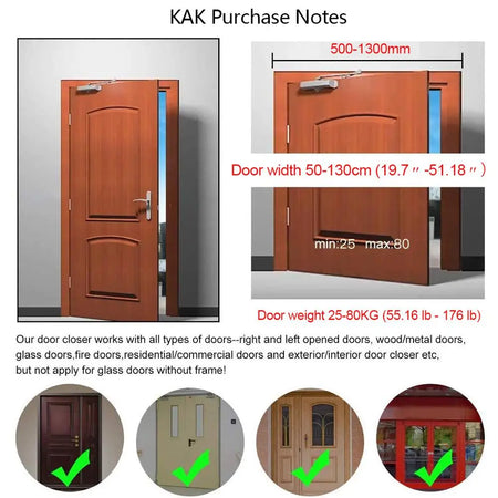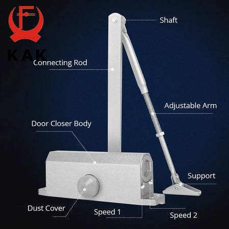 Познакомьтесь с KAK Door Closer 2 Spring Hydraulic Buffer Adjustable Speed — прочным доводчиком из алюминиевого сплава, созданным для мягкого, безопасного и тихого закрывания дверей. С двумя пружинами и гидравлическим буфером этот доводчик обеспечивает плавную, регулируемую скорость закрывания, уменьшая хлопки, износ и шум, защищая петли, рамы и пользователей. Доступен в черном и серебристом цветах, поддерживает двери весом 25–80 кг и подходит для широкого спектра коммерческих и жилых помещений.