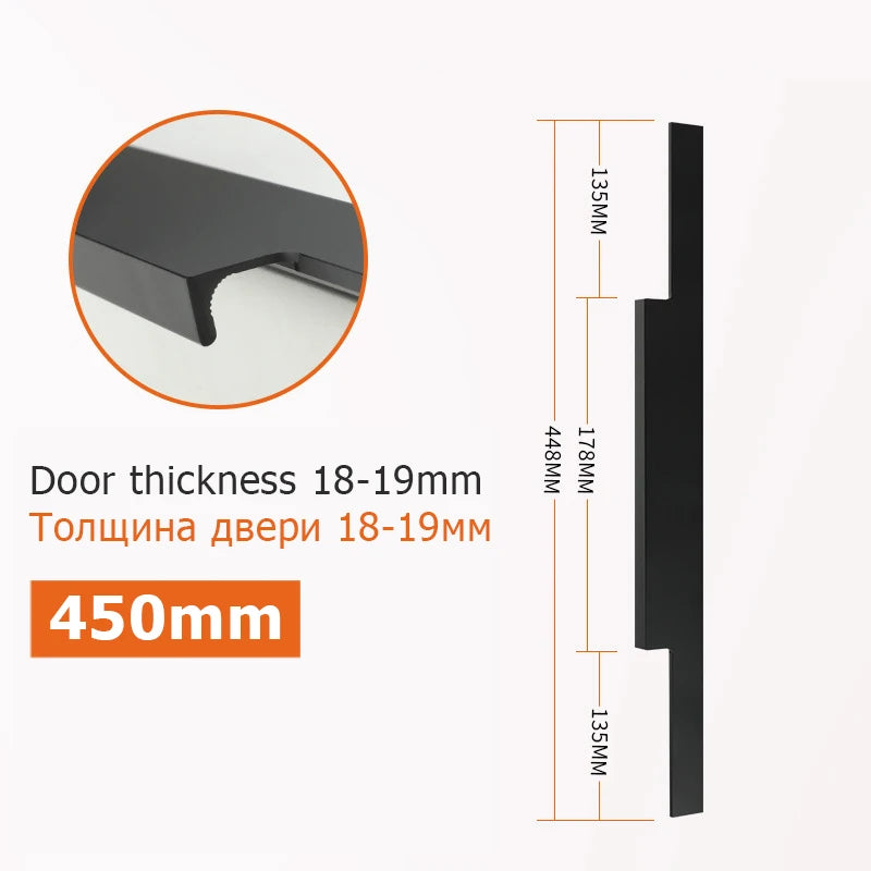 - Длинные размеры для больших дверей: Выбирайте 400–800 мм, чтобы подойти для больших дверей гардероба или широких ящиков с комфортным захватом.
