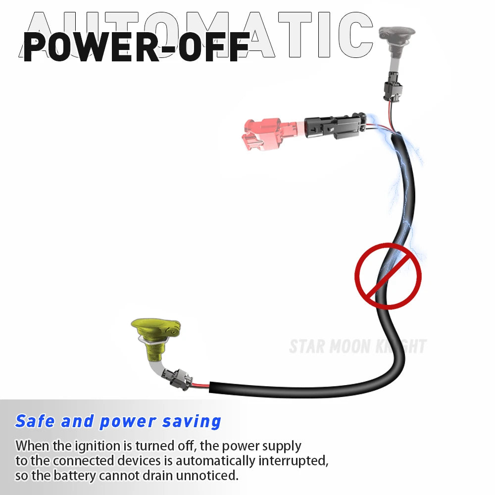 - Держите необходимое оборудование включенным в движении и автоматически защищайте аккумулятор при выключенном зажигании.