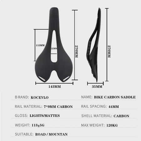 Седло Kocevlo Carbon Fiber Ultralight Road MTB разработано для скорости, эффективности и долговечности. Изготовленное с поверхностью из углеродного волокна 3K и рельсами из высокопрочного углеродного волокна, это седло обеспечивает ощущение легкости без ущерба для поддержки. Его компактный размер 270x143 мм обеспечивает отзывчивую езду, помогая передавать силу непосредственно на педали при подъёмах и спринтах. Весит около 105–120 г и рассчитано на нагрузку до 110 кг, подходит для унисекс-райдеров как на шоссейных, так и на горных велосипедах. Черная текстура 3K, доступная в матовом и глянцевом вариантах, придаёт премиальный вид, выдерживающий ежедневные тренировки и гоночные условия.