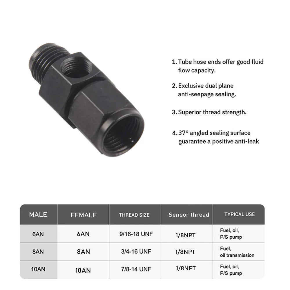 - Выберите правильный размер (AN4, AN6, AN8 или AN10), чтобы соответствовать вашей существующей шланговой сборке и потребностям датчиков для чистого, герметичного обновления или переоборудования.