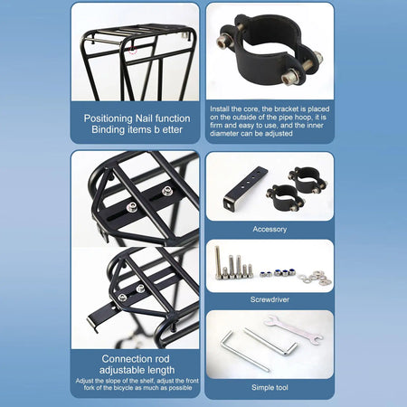 Улучшите каждую поездку с передним багажником для велосипеда – прочным стальным решением, разработанным для расширения возможностей вашего велосипеда по перевозке грузов. Созданный для стабильности, этот багажник, установленный на вилку, оснащен механизмом крепления без люфта и трапециевидной рамой, обеспечивая прочную и надежную платформу как для горных, так и для шоссейных велосипедов. Независимо от того, направляетесь ли вы на тропу, в поход или на рыбалку на выходных, этот передний багажник держит ваше снаряжение под рукой и надежно закрепленным.