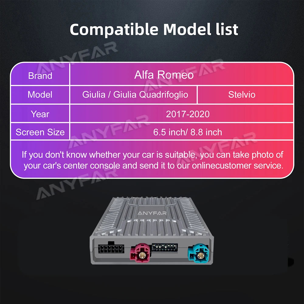 Upgrade your Alfa Romeo Stelvio or Giulia with a discreet, OEM‑like retrofit using ANYFAR’s Wireless CarPlay and Android Auto module. This decoder box adds CarPlay and Android Auto functionality to your existing UConnect display, preserving the original dashboard look and controls while unlocking modern connectivity. Seamlessly switch between your phone and the car’s built‑in screen, keeping your steering wheel and rotary controls intact for a true factory feel.