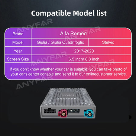 To determine compatibility with your exact Alfa Romeo model and center console, our support team can help—just send photos of your car’s center console and we’ll guide you through the fitment check.