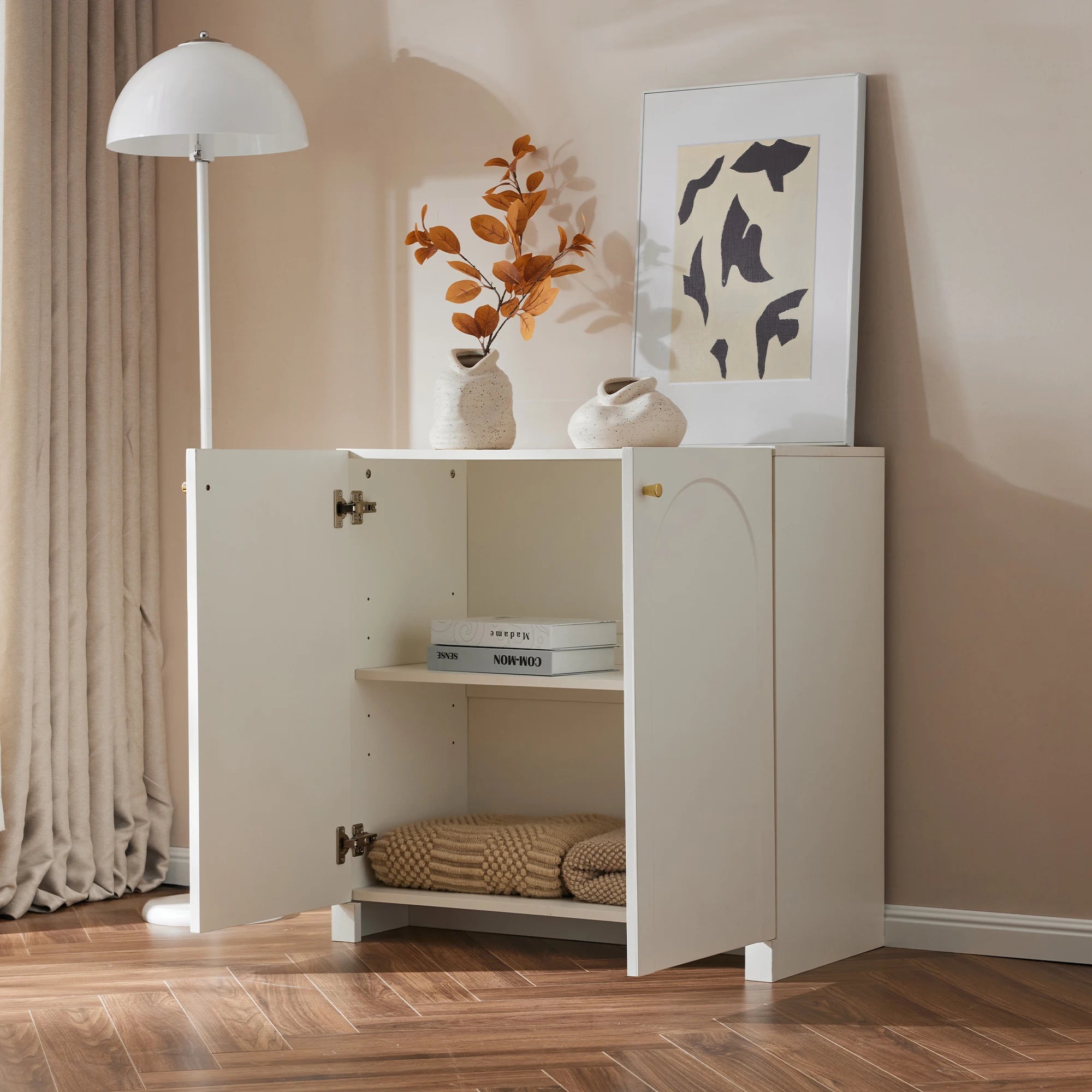 Внутреннее пространство достаточно просторное для книг, очков, будильников или повседневных предметов, что помогает поддерживать порядок, не жертвуя стилем. Кремово-белое покрытие освещает комнаты и прекрасно сочетается с различными интерьерами — от современных до вдохновленных винтажем.