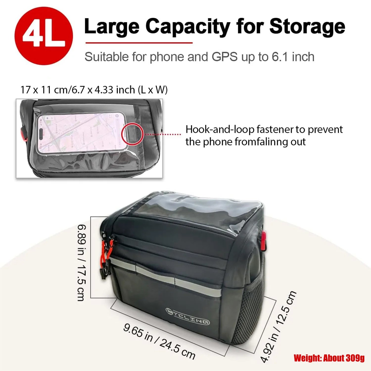 Предупреждения/напоминания: Не переполняйте сумку более 4 л, чтобы сохранить баланс и безопасную езду. Убедитесь, что сумка надежно закреплена на руле перед каждой поездкой.