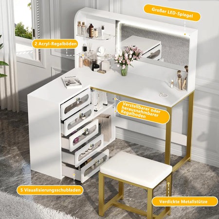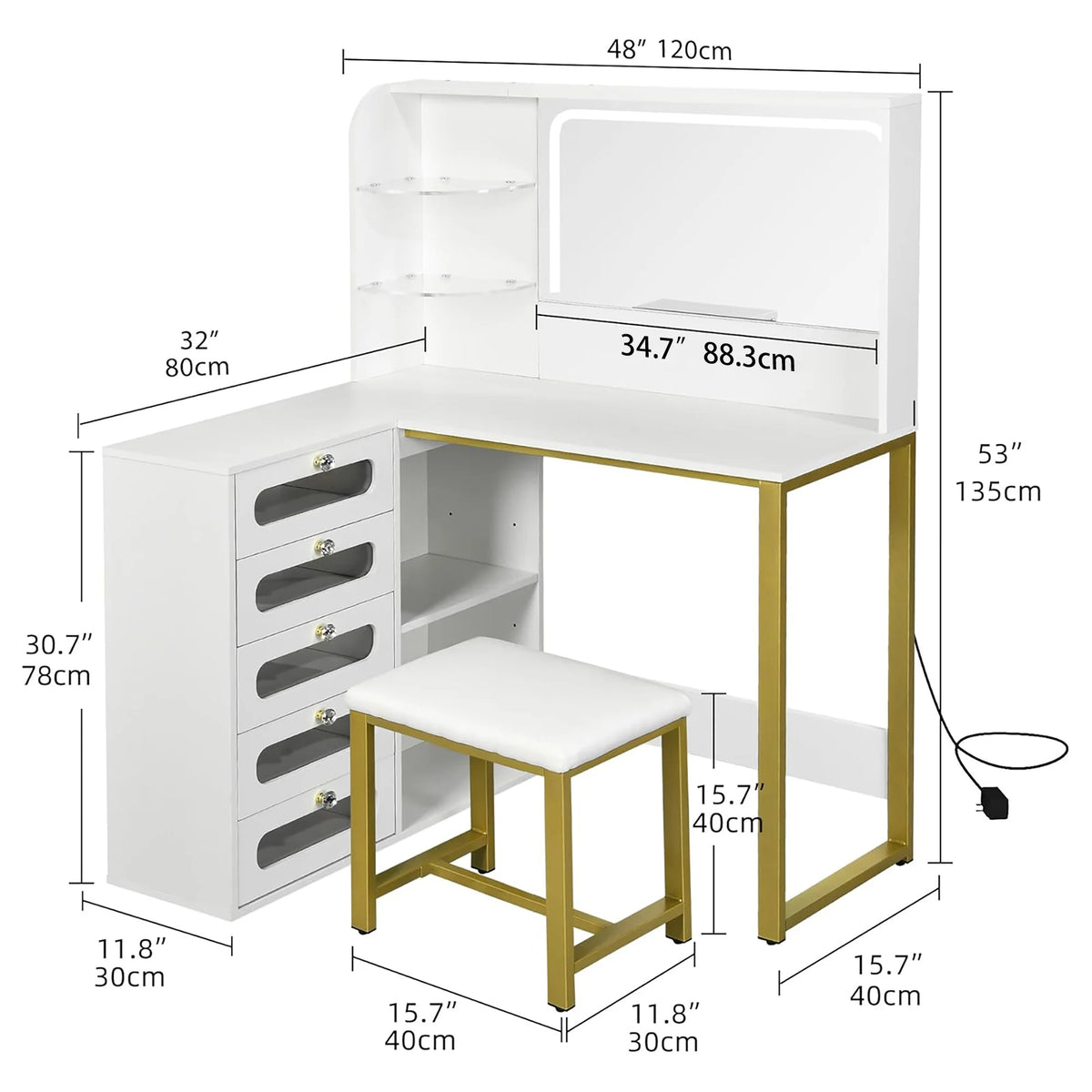 Созданный для организованных бьюти-рутин, он оснащён пятью большими ящиками с регулируемыми/съёмными полками для аккуратного хранения косметики, украшений и аксессуаров в ряд. Встроенная система освещения обеспечивает равномерное, естественное освещение, помогающее наносить макияж с точностью и уверенностью, а включённый табурет для макияжа обеспечивает комфортное и дышащее сиденье для длительных процедур. В комплект входит зеркало, завершающее комплект туалетного столика, делая ежедневный макияж лёгким.