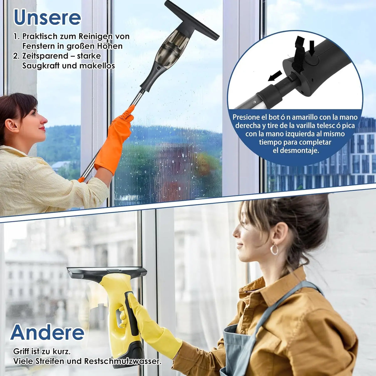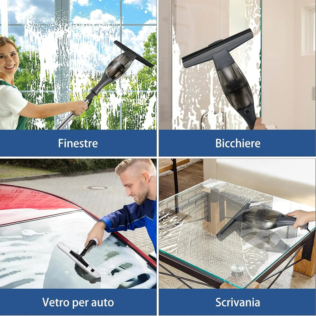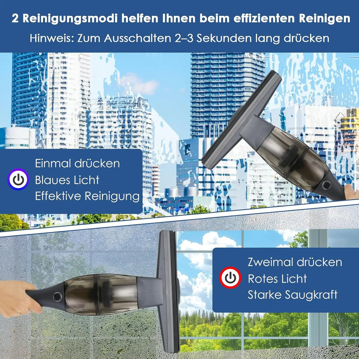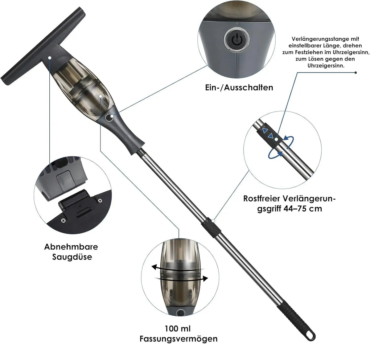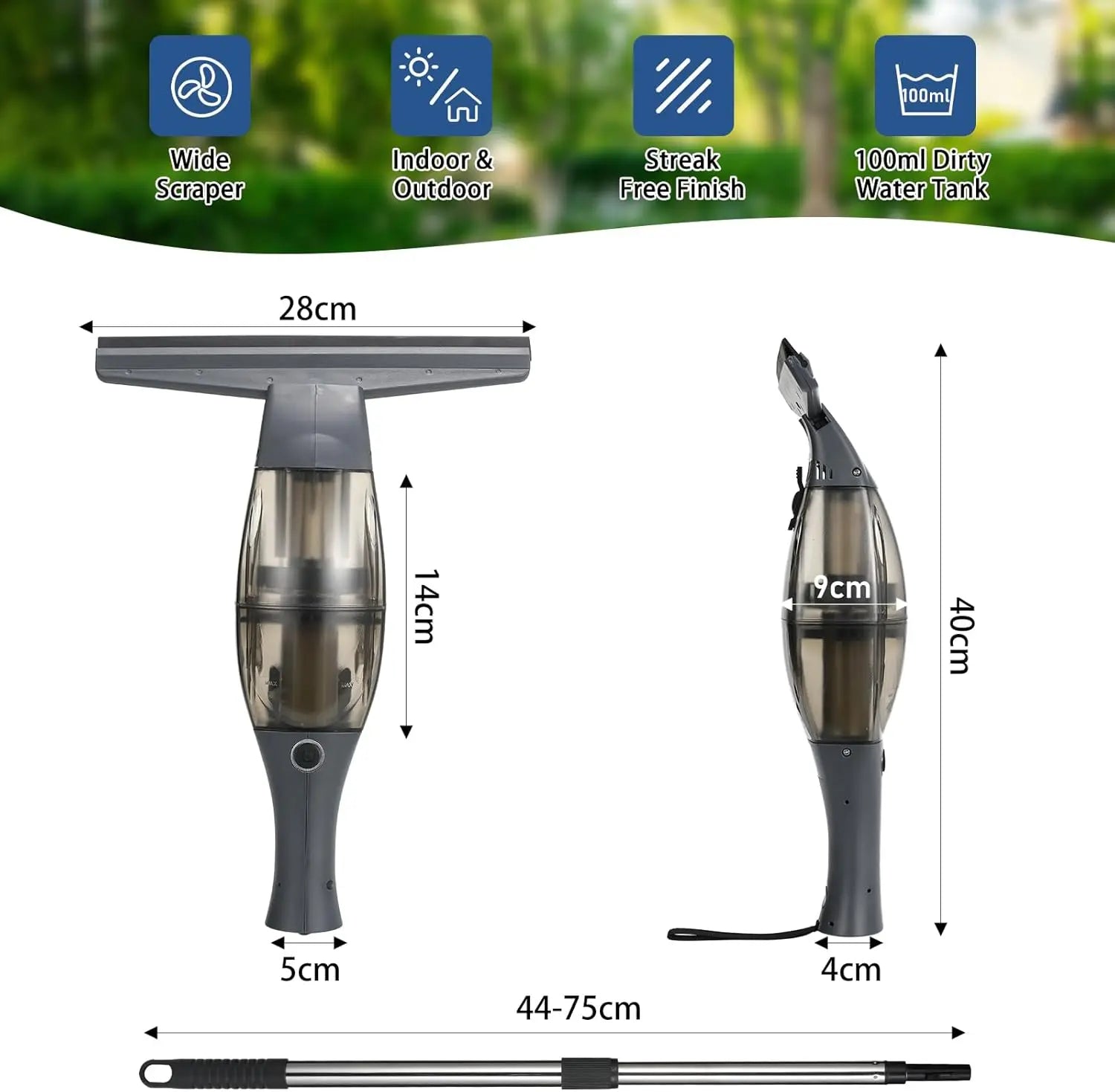 Познакомьтесь с набором Mvpower для мытья окон с телескопической ручкой, пульверизатором и лезвием шириной 280 мм — компактным беспроводным помощником для быстрой уборки окон, плитки, зеркал и других гладких стеклянных поверхностей. Этот 3-в-1 электрический очиститель окон сочетает в себе скребок, пылесос и пульверизатор в одном удобном инструменте, обеспечивая бесследный результат с минимальным капанием. Мотор мощностью 10 Вт обеспечивает два уровня всасывания и широкую насадку 280 мм, удаляя грязную воду во время протирания. Телескопическая ручка удлиняется с 44 до 75 см для высоких окон, а вращающаяся на 360° головка облегчает быструю и легкую очистку от края до края.