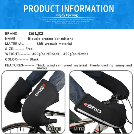 Держите руки в тепле и защите во время холодных и влажных поездок с водонепроницаемыми зимними рукавицами GIYO для руля велосипеда. Разработанные как для шоссейного, так и для горного велосипеда, эти ветрозащитные вязаные рукавицы надеваются на руль, создавая практичную барную рукавицу, которая оставляет пальцы свободными для быстрого торможения и переключения передач. Изготовленные из высококачественного материала для гидрокостюмов SBR и 5 мм слоя неопренa с нейлоновой ламинацией с каждой стороны, они обеспечивают надежную водонепроницаемость и гибкое тепло даже в сырых и холодных условиях.
