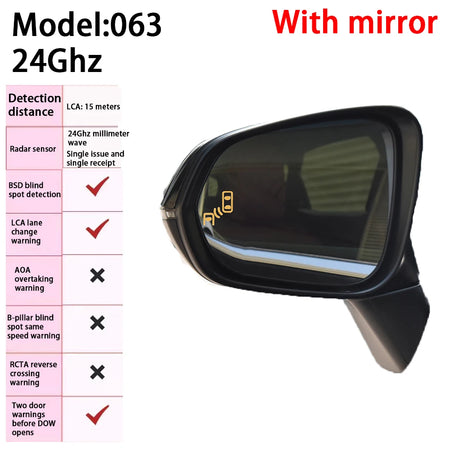 Два основных метода отображения обеспечивают гибкость видимости: отображение на линзе с подсветкой на физической линзе или дисплей в автомобиле, где предупреждающий свет появляется на треугольном окне внутри автомобиля. Система поддерживает множество функций безопасности, таких как LCA (ассистент смены полосы), BSD (мониторинг слепых зон), AOA (активное предупреждение о обгоне), предупреждение о слепой зоне на стойке B, RCTA (предупреждение о заднем пересечении) и опциональное DOW (предупреждение об открывании двери).