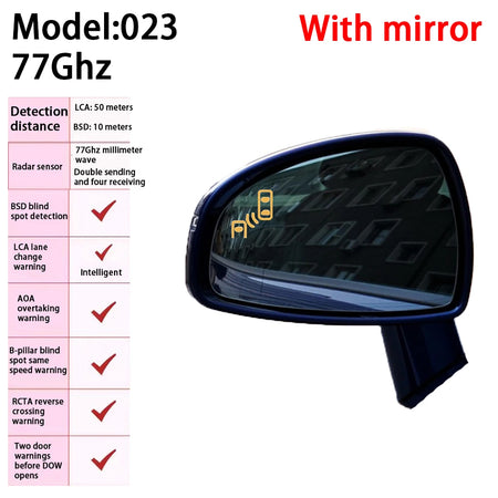 Система совместима с двумя основными вариантами отображения: дисплей с линзой с индикатором на самой линзе или встроенный дисплей с предупреждающим светом, отображаемым на треугольном окне внутри автомобиля. Она также предлагает набор функций для более безопасного вождения, включая помощь при смене полосы LCA, мониторинг слепых зон BSD, предупреждение о активном обгоне AOA, предупреждение о слепой зоне B-стойки, предупреждение о заднем пересечении RCTA и дополнительное предупреждение о открывании двери DOW.
