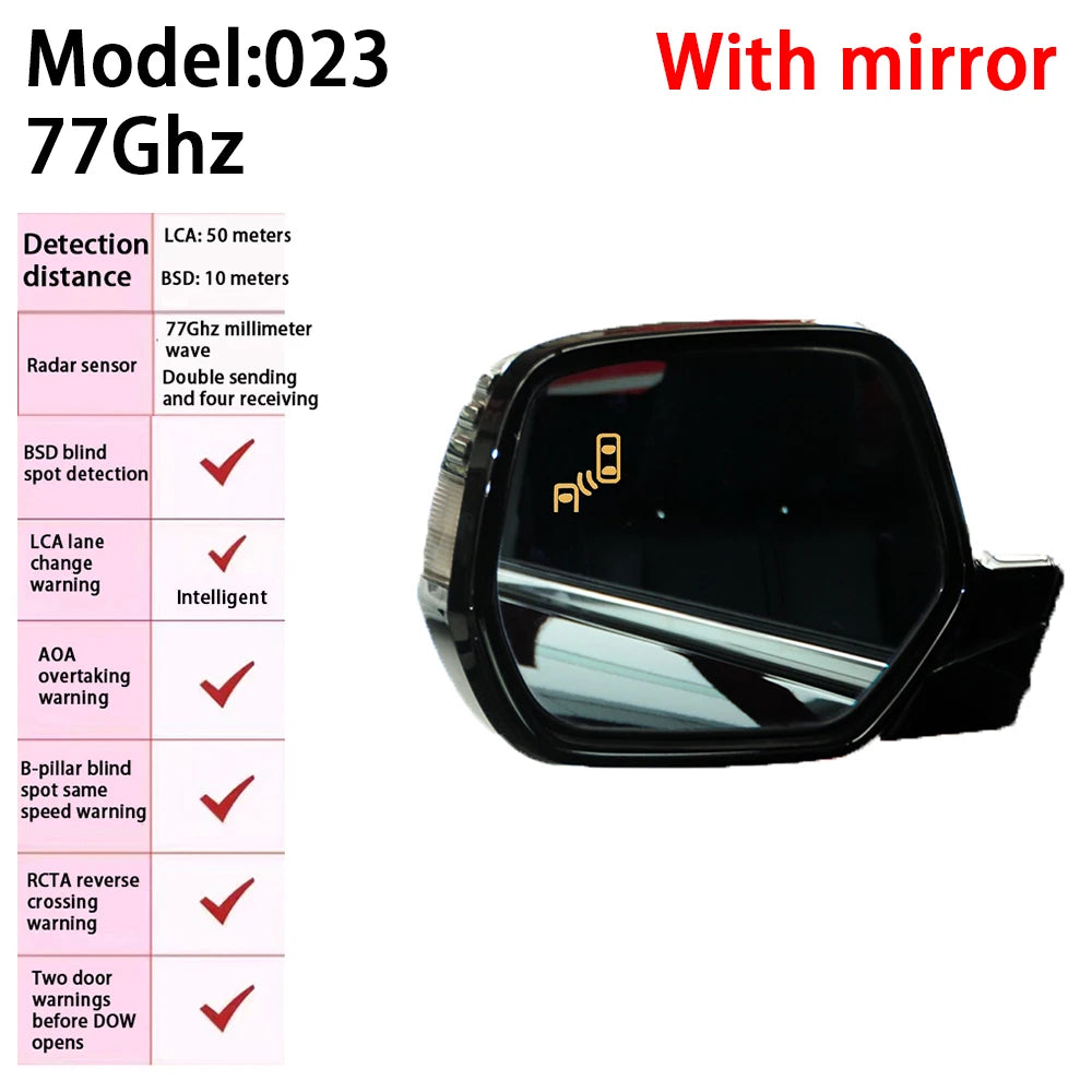 - Поведение оповещения: активация бокового поворотника, вспышка светодиода и/или трехтональный сигнал, когда движущийся объект попадает в зону обнаружения