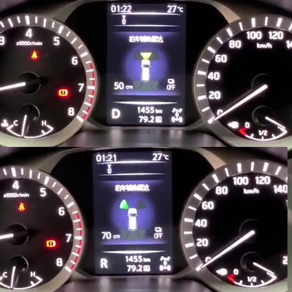 Система спроектирована с улучшенным чипом для стабильности, чувствительности и более быстрого отклика. Она использует практическую настройку радаров спереди и сзади: когда вы выбираете режим Движение (D) и скорость падает ниже 15 км/ч, передний радар активируется автоматически; выбор Реверс (R) автоматически включает задний радар. Конфигурация из четырех датчиков включает два датчика на переднем бампере и два на заднем, обеспечивая надежные показания расстояния в сложных парковочных ситуациях. Датчики с рейтингом IPX7 устойчивы к грязи и воде, что делает очистку и мойку автомобиля рутинным обслуживанием без проблем. HD-линзы улучшают видимость препятствий, способствуя более четким указаниям расстояния в различных условиях освещения. Все монтажные отверстия берутся из зарезервированных мест на бампере, избегая видимых модификаций и сохраняя эстетическую привлекательность автомобиля.