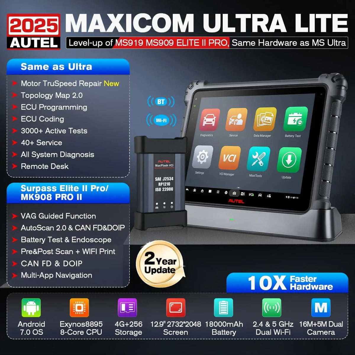 Zoznámte sa s Autel MS919 MaxiSys Ultra Scanner s TruSpeed a Topology 2.0—prémiový automobilový diagnostický tablet navrhnutý pre profesionálne garáže a vážnych DIYerov. Tento robustný nástroj poskytuje rýchlu, presnú diagnostiku naprieč 150+ značkami, s dynamickým mapovaním topológie na vizualizáciu vzťahov systémov vozidla, programovaním ECU a online kódovaním a množstvom 40+ servisných funkcií. 12,9-palcový vysokorozlíšený kapacitný dotykový displej zabezpečuje ostré detaily a plynulú navigáciu, zatiaľ čo operačný systém Android 7.0 a osemjadrový procesor Samsung Exynos 8895V udržujú skenovanie rýchle a multitasking bezproblémový. S 4GB RAM a 256GB interného úložiska môžete spúšťať viacero aplikácií, ukladať výsledky skenovania a aktualizovať softvér s dôverou cez 4G a dvojité Wi-Fi. MaxiSys Ultra podporuje 21+ jazykov, aby vyhovoval globálnym tímom a technikom. Všetko elektronické a mechanické vybavenie, zariadenia a stroje predávané spoločnosťou InterCyprus do krajín EÚ sú certifikované CE a majú dvojročnú záruku.