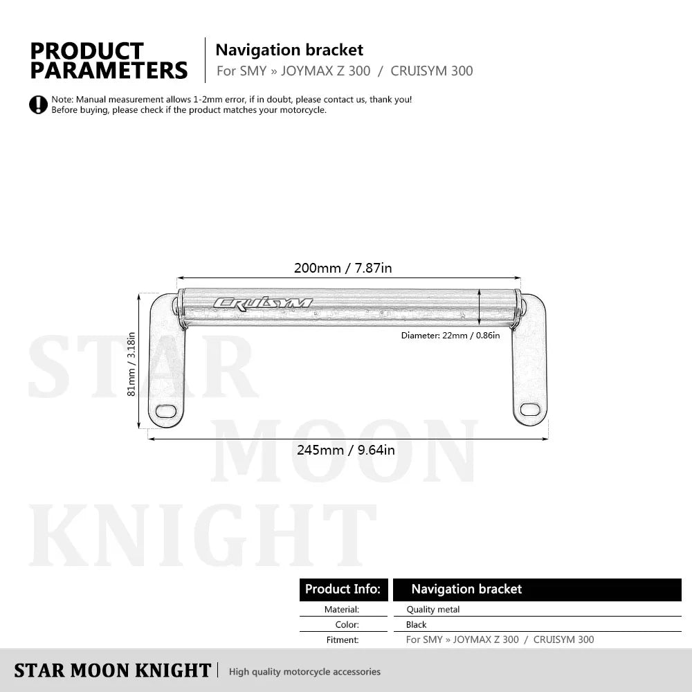 - Veľkosť: Priemer priečnika: 22 mm (0.87"), Dĺžka priečnika: 202 mm (7.97"), Dĺžka montáže medzi otvormi: 225 mm (8.85")