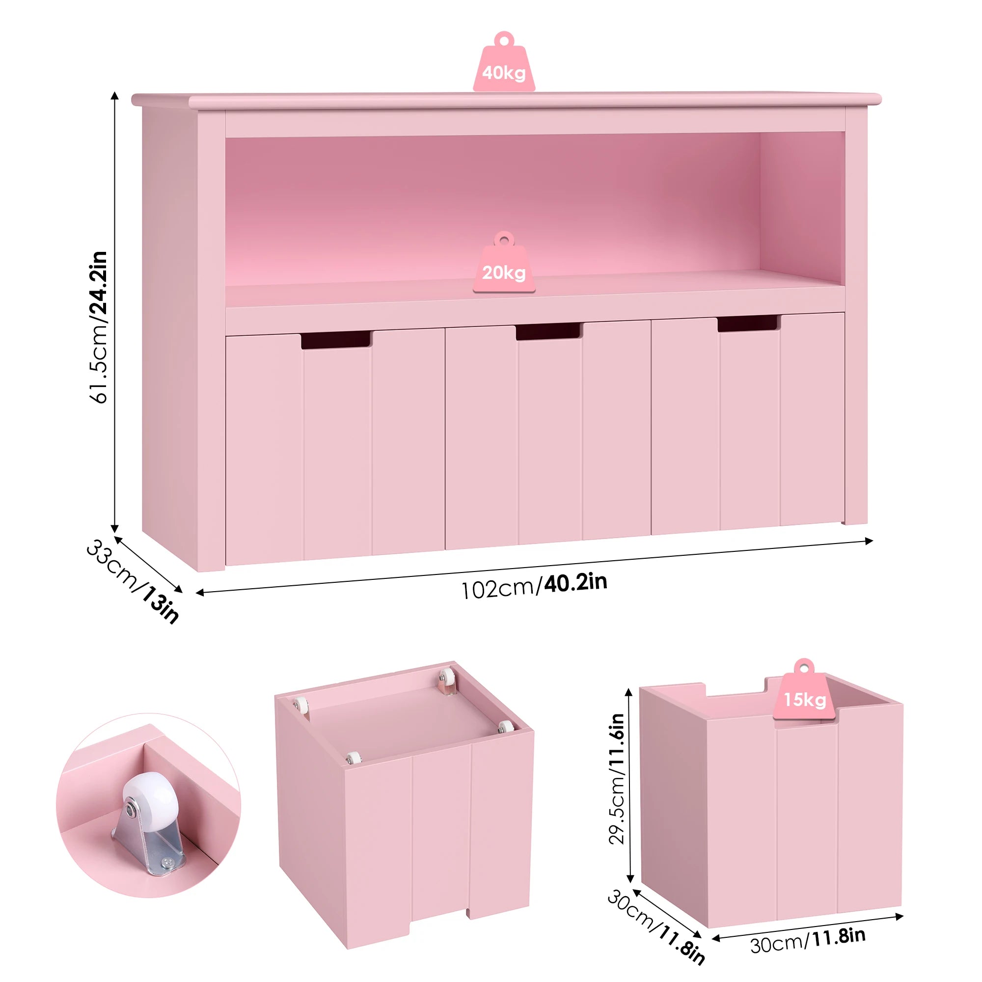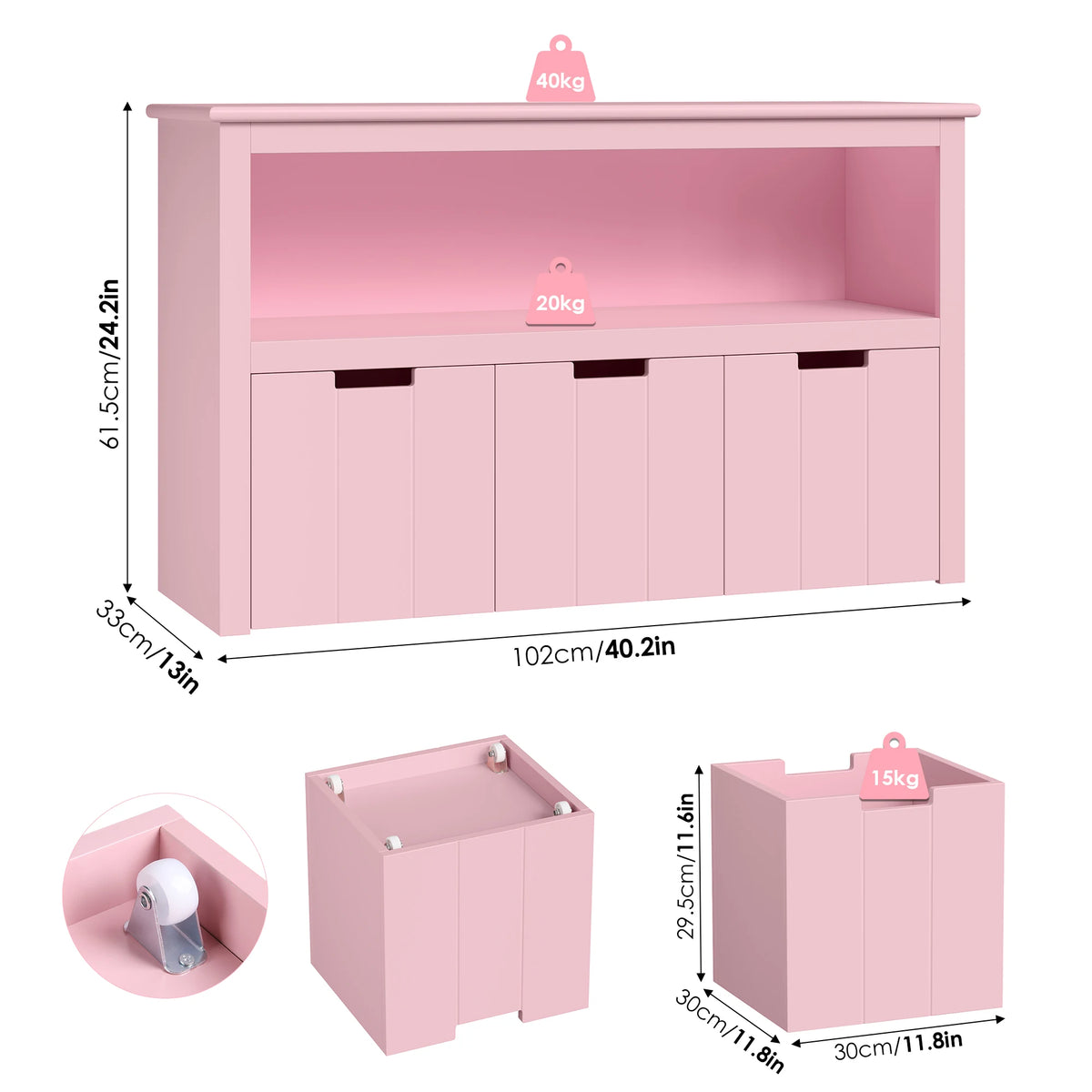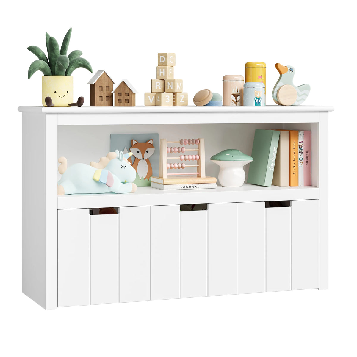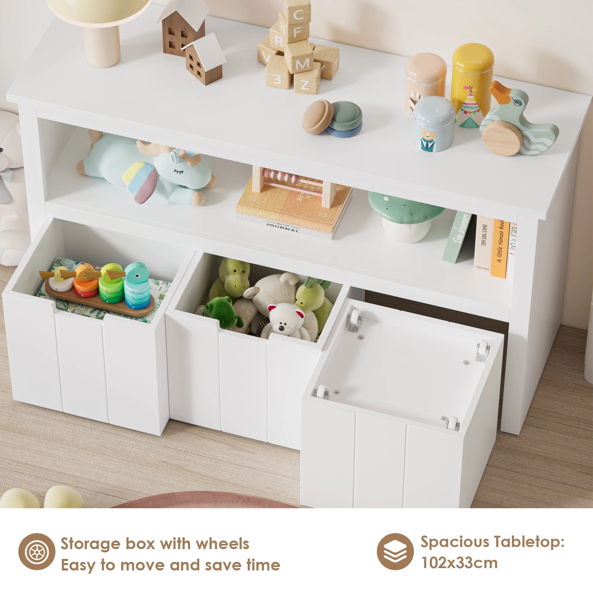 Udržujte čas na hranie organizovaný a zábavný s bielou drevenou jednotkou na úložisko hračiek s kolieskami a 3 zásuvkami. Vyrobená z MDF dosky (trieda E1) v jasnej bielej farbe, toto všestranné úložné riešenie je navrhnuté pre detské izby a herné priestory. Tri kolieskové zásuvky sa hladko posúvajú, čo uľahčuje malým deťom prístup k hračkám, bábikám, knihám alebo oblečeniu, zatiaľ čo vy udržiavate uprataný priestor. S veľkorysými rozmermi 102 cm na dĺžku, 33 cm na šírku a 61.5 cm na výšku sa zmestí do úzkych kútov a dá sa ľahko presúvať vďaka praktickým kolieskam. Drážkovaný dizajn zásuviek pomáha predchádzať zaseknutiu, takže deti môžu používať jednotku s dôverou a samostatne. Táto kompaktná jednotka slúži ako úložná polica a malá knižnica, rastie s vaším dieťaťom, keď sa menia jeho potreby na úložisko.