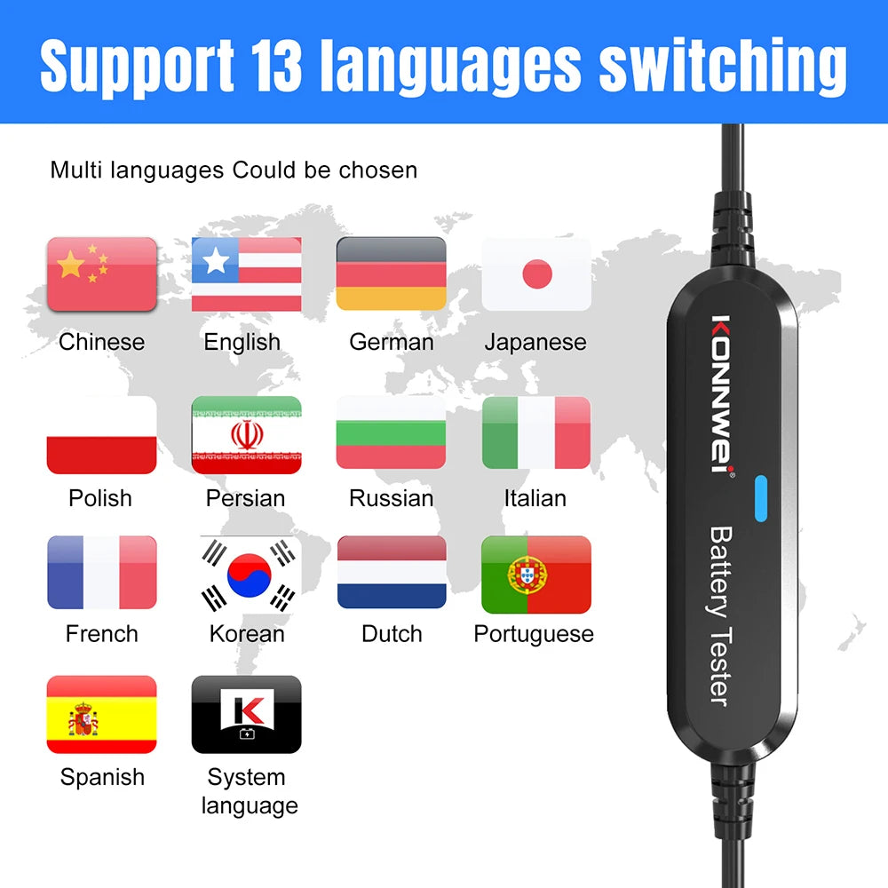 Podpora jazykov: KONNWEI BK200 podporuje 13 jazykov: čínsky, anglický, nemecký, francúzsky, japonský, holandský, ruský, španielsky, taliansky, kórejský, portugalský, poľský, perzský. Zobrazenie jazyka automaticky nasleduje jazykové nastavenie systému vášho zariadenia.