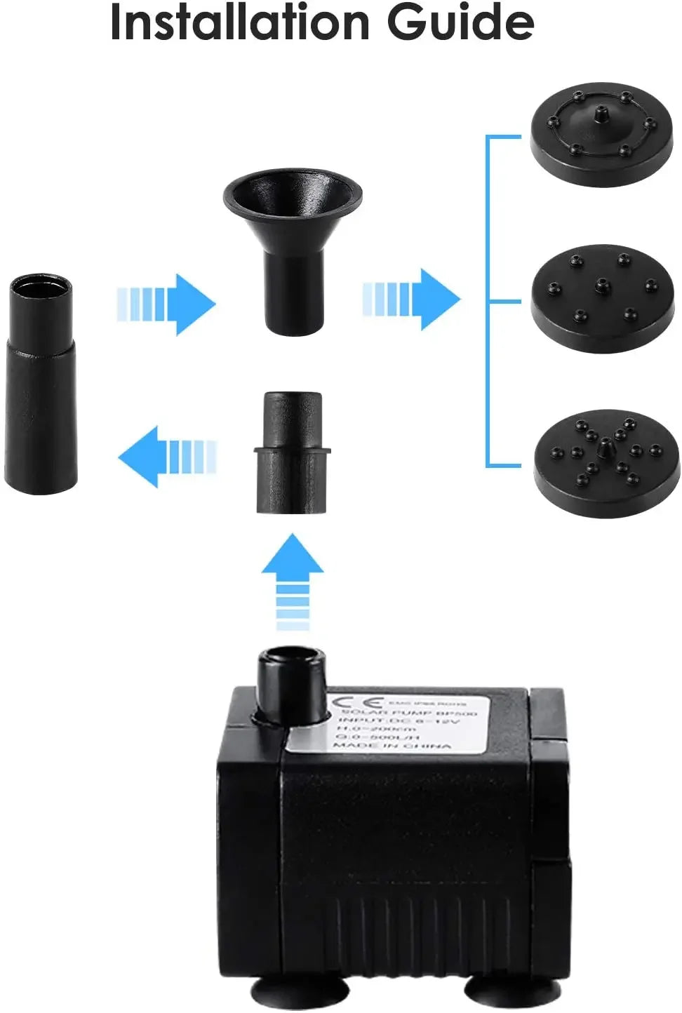 - Flexibilné štýlovanie: Štyri tryskové uzávery vám umožňujú prepnúť medzi vzormi fontány, aby vyhovovali vášmu rybníku, vtáčiemu kúpeľu alebo hydroponickému usporiadaniu. Tip: udržujte vodu čistú a bez nečistôt, aby ste predišli upchatiu.