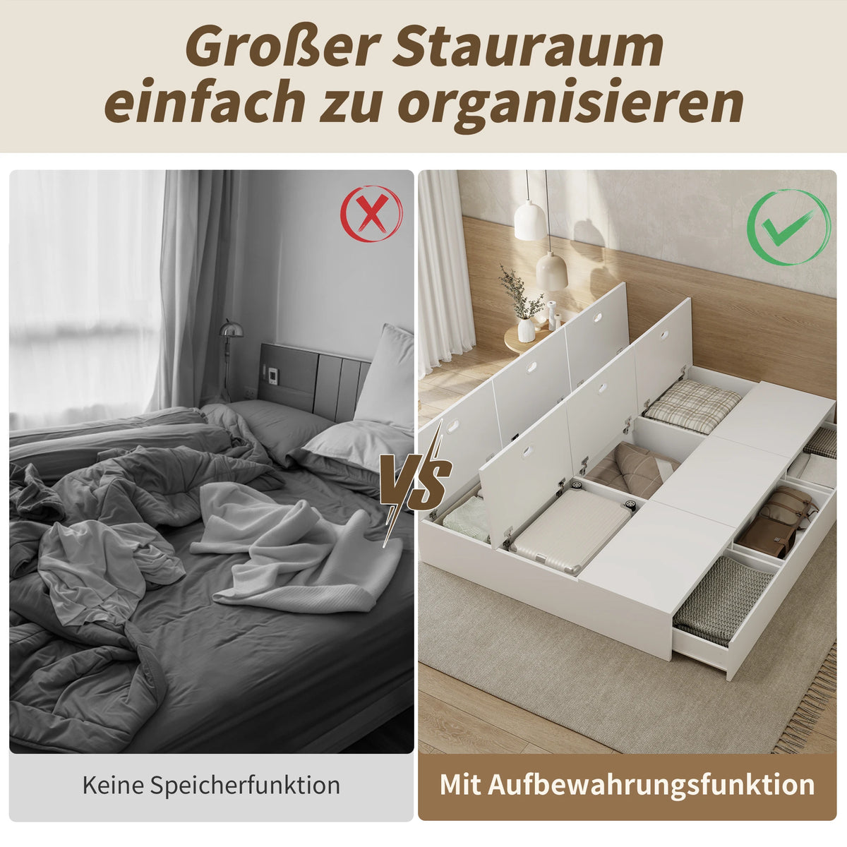 - Biely rám postele na úložný priestor (140x200 cm) so šiestimi úložnými boxami pod posteľou a tromi bočnými zásuvkami
