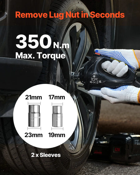 - Elektrický kľúč: maximálny krútiaci moment 350 N·m; obsahuje 2 šesťhranné zásuvky kompatibilné s veľkosťami skrutiek 17/19 mm a 21/23 mm.