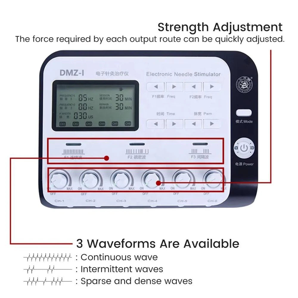Zariadenie zmierňuje svalovú bolesť a zlepšuje regeneráciu poskytovaním presnej, nastaviteľnej elektrickej stimulácie na akupunktúrne body. Jeho viacvýstupný dizajn šetrí čas a cieli na viacero oblastí, čím zlepšuje pohodlie používateľa a účinnosť liečby. Jednoduché ovládanie a jasný frekvenčný rozsah ho robia prístupným pre technických aj netechnických používateľov.