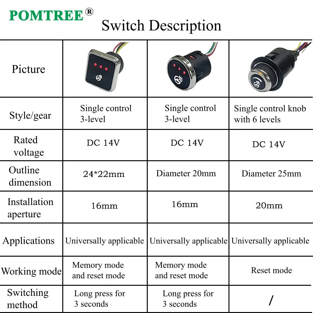 - 6-úrovňové prepínanie ohrevu: Zahrňuje možnosti s a bez pamäťovej funkcie (závislé od inštalácie); prepínač sa môže resetovať po vypnutí auta alebo si zapamätať posledné nastavenie