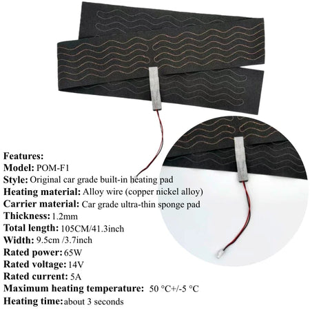 Ohrievač funguje z DC 12V systému a používa vyhrievaciu podložku z zliatinového drôtu na rovnomerné rozloženie tepla po celom volante. S menovitým výkonom 65W a rozsahom teploty ohrevu 45°C–55°C získate spoľahlivé pohodlie bez prehriatia. Dĺžka podložky 105 cm (41,3 in) a šírka 9,5 cm (3,7 in) zabezpečujú široké pokrytie a kompatibilitu s rôznymi volantmi. Prepínač s 6 úrovňami ovládania vám umožňuje prispôsobiť teplo podľa vašich preferencií, od jemného dotyku po teplý úchop. V závislosti od inštalácie môže prepínač ponúkať pamäť ohrevu alebo sa resetovať po vypnutí auta, čo vám poskytuje flexibilnú kontrolu nad pohodlím v chladnom počasí.