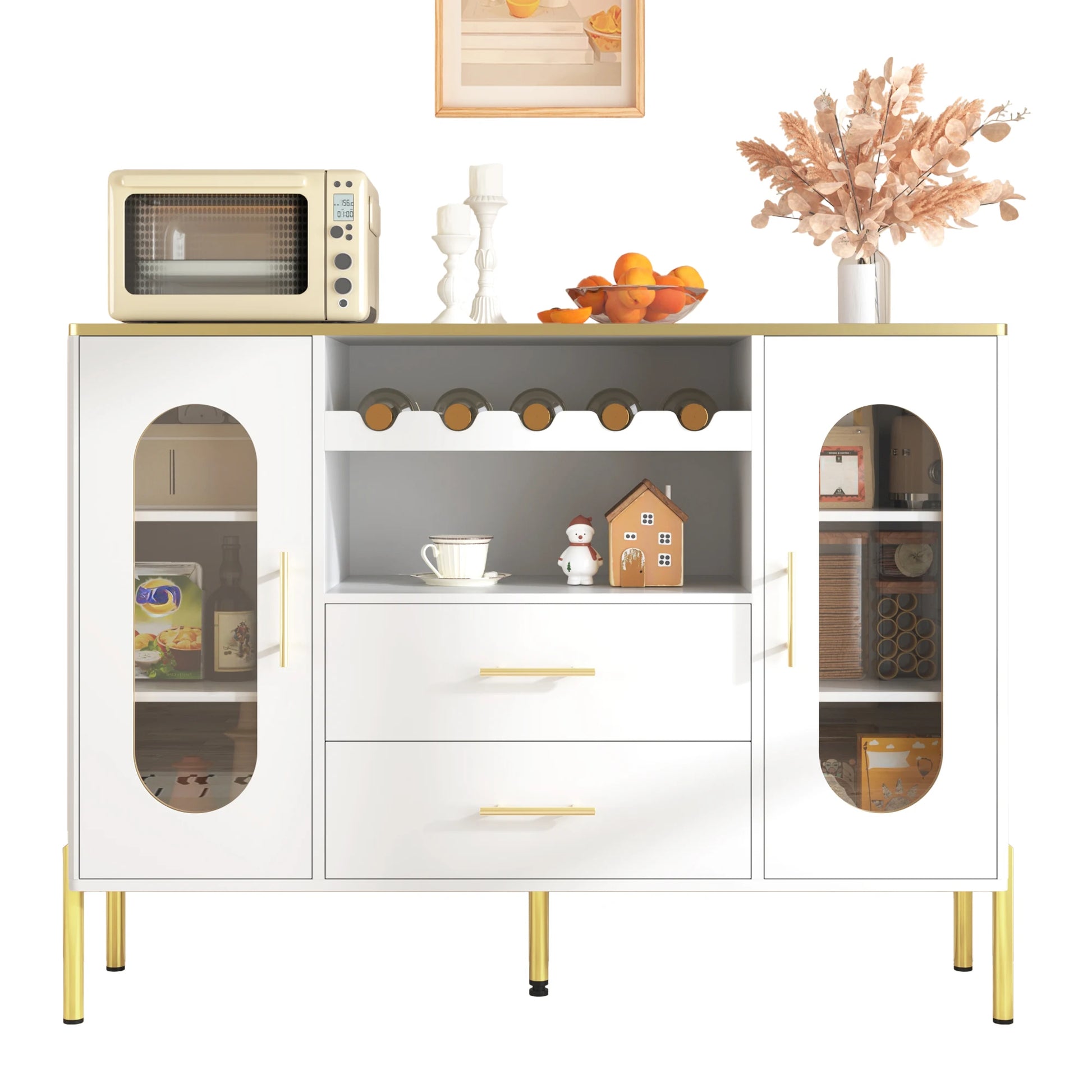 Predstavujeme Bielu komodu s presklenými dverami a úložným priestorom na víno — všestranné úložné riešenie, ktoré spája čisté línie s rafinovanými detailmi. Vyrobená z pevného MDF s hladkým bielym povrchom pre trvanlivosť, má zlaté úchyty a nohy z hliníkovej zliatiny s elektrolyticky pokoveným povrchom pre sofistikovaný dizajn a ochranu proti hrdzi. Oválne presklené dvere dodávajú ľahký, vzdušný pocit, ktorý sa bezproblémovo hodí do moderných, klasických alebo minimalistických obytných priestorov. Táto komoda je navrhnutá tak, aby udržiavala jedálne organizované a zároveň pridávala nádych elegancie.