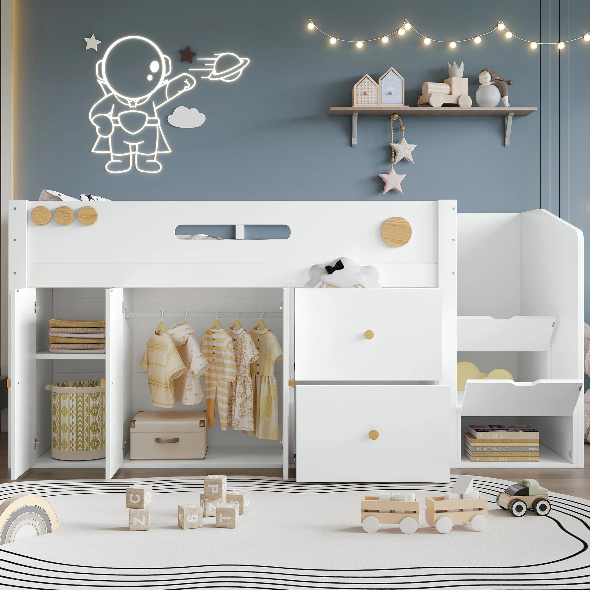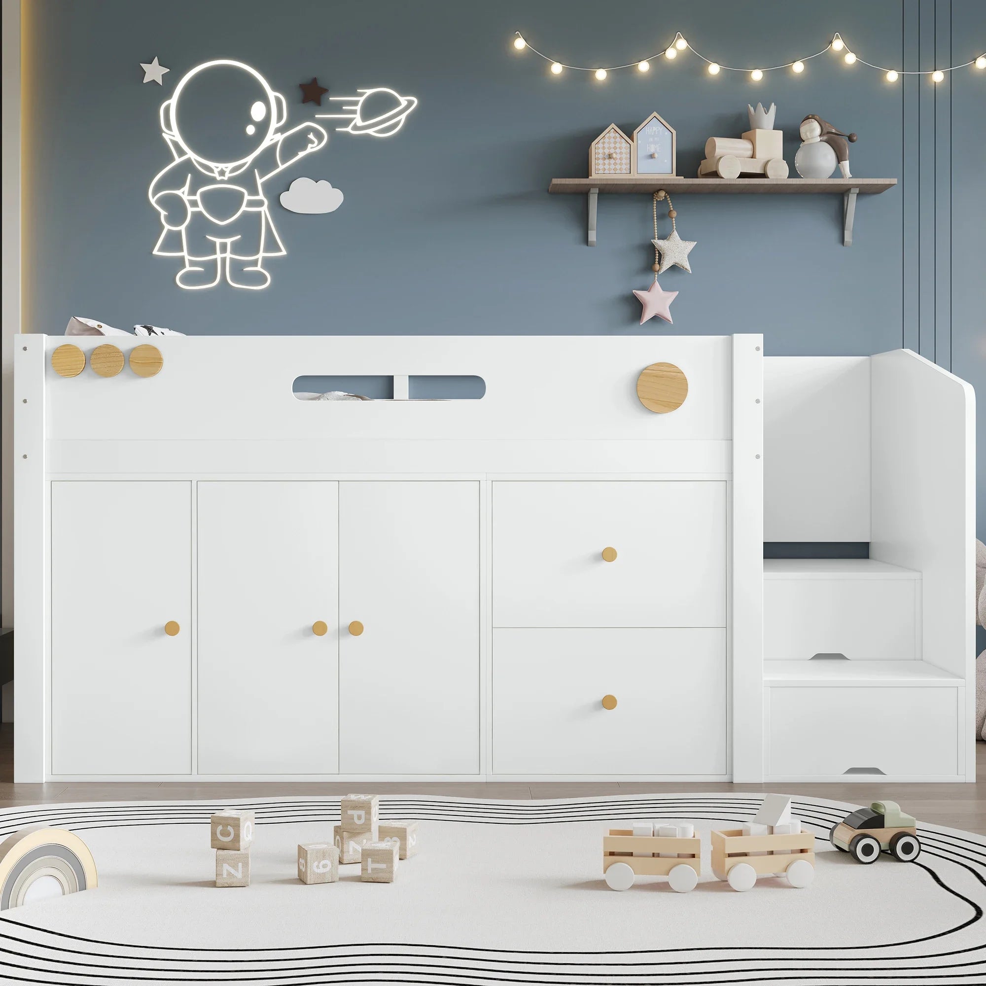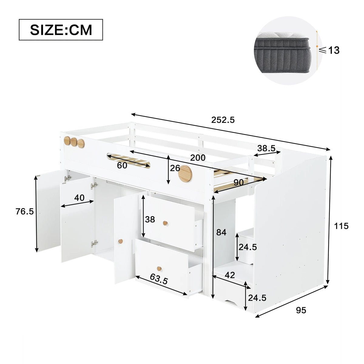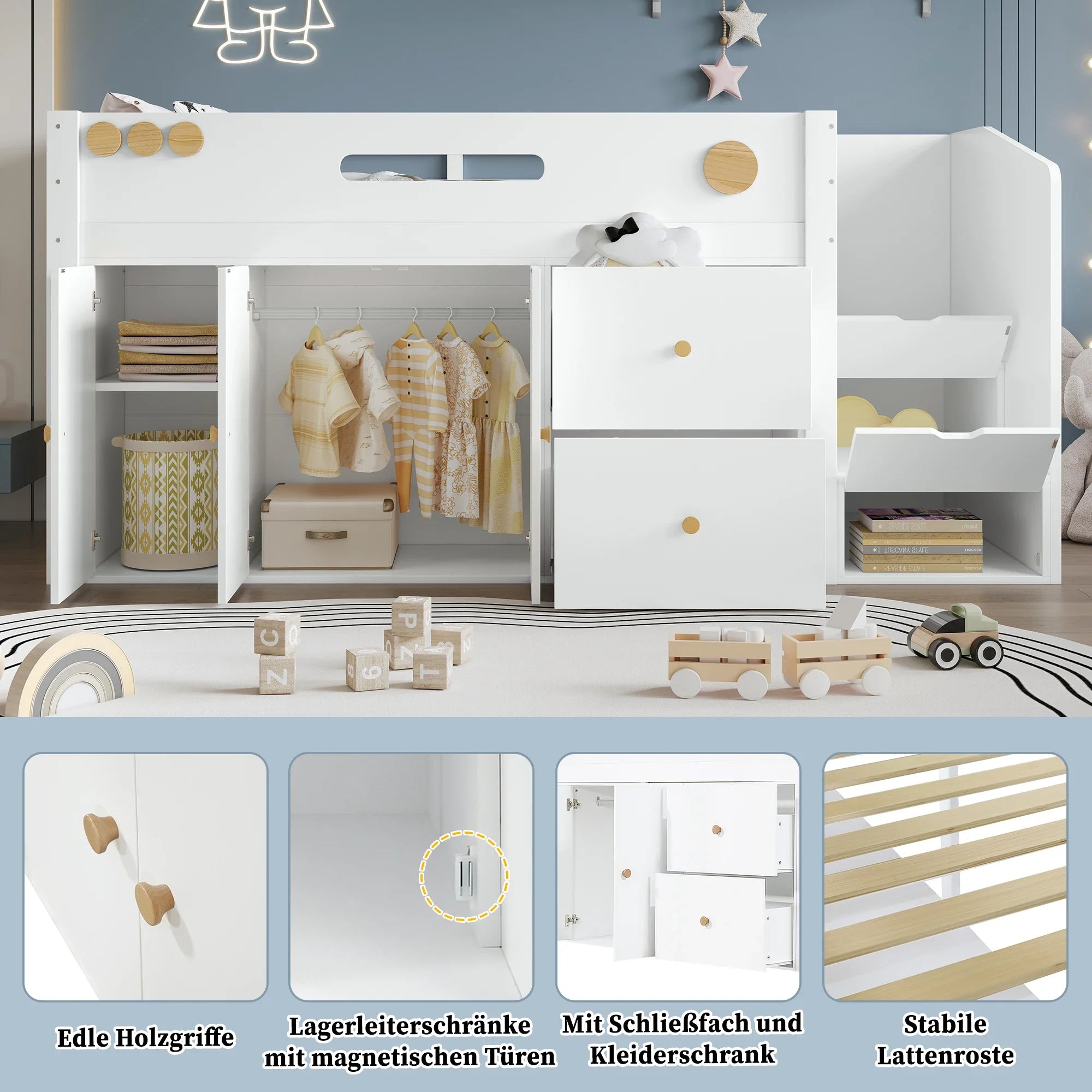 Predstavujeme Drevenú Posteľ pre Deti s Polovičnou Výškou a Úložným Priestorom a Skriňou 90x200 — robustné, priateľské riešenie na spanie, ktoré rastie s vaším dieťaťom. Vyrobená z borovice, MDF a preglejky, táto posteľ spája odolnú konštrukciu s jemným, príjemným vzhľadom. Biela a prírodná povrchová úprava pridáva teplo do každej detskej izby alebo izby pre deti, zatiaľ čo integrované úložné možnosti pomáhajú udržiavať hračky, oblečenie a posteľnú bielizeň pekne usporiadané. S dizajnom strednej výšky a ľahko prístupnými úložnými schodmi je to bezpečnejšie pre malých lezcov a maximalizuje priestor na hranie.