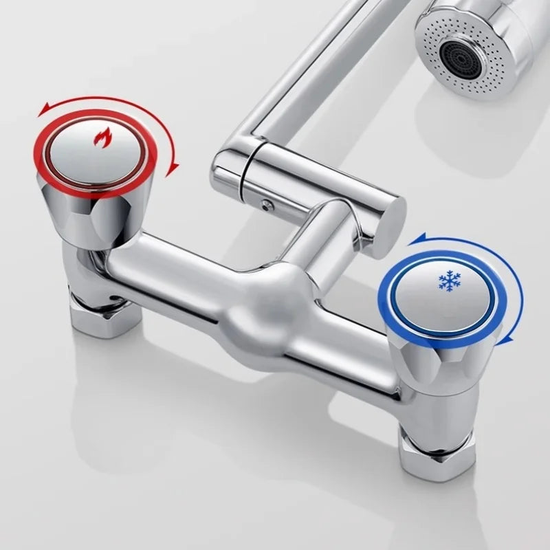 2 Načina Stenska Pipa – Mešalnik Hladne in Tople Vode 360° Rotacija — Vsestranski stenski mešalnik s dvojno ročico in popolno 360° rotacijo za brezskrbno preklapljanje med hladno in toplo vodo. Izdelan iz trdnega medenine za zanesljivo vsakodnevno uporabo.