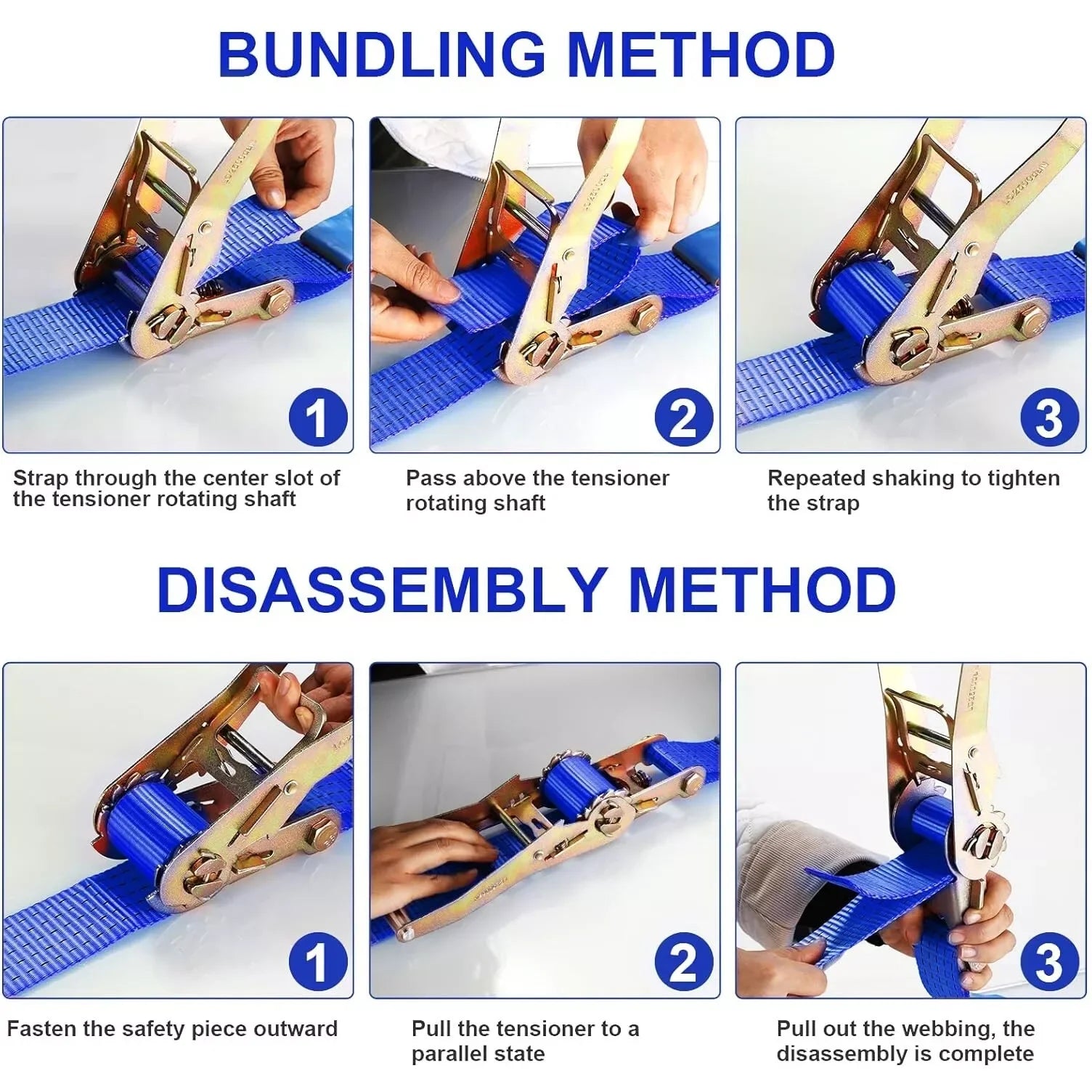 - Pred vsako uporabo preverite trakove zaradi strganja, prerezov ali korozije v napenjalniku; shranjujte na suhem in hladnem mestu, ko jih ne uporabljate, da podaljšate njihovo življenjsko dobo.