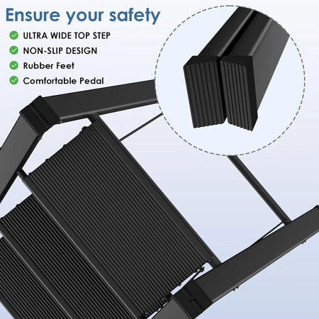 Ko morate delati na višini, se ta lestev hitro zloži za enostaven transport in kompaktno shranjevanje. Lahka in prenosna, tehta 2,57 kg (2-stopni), 3,37 kg (3-stopni) ali 4,25 kg (4-stopni), kar omogoča enostavno premikanje po domu ali pisarni. Široke stopnice zagotavljajo stabilno, udobno stojišče, teksturirane nedrseče površine pa pomagajo preprečiti zdrs, tudi ko ste zaposleni z nalogami, kot so slikanje, čiščenje ali lahka vzdrževanja.