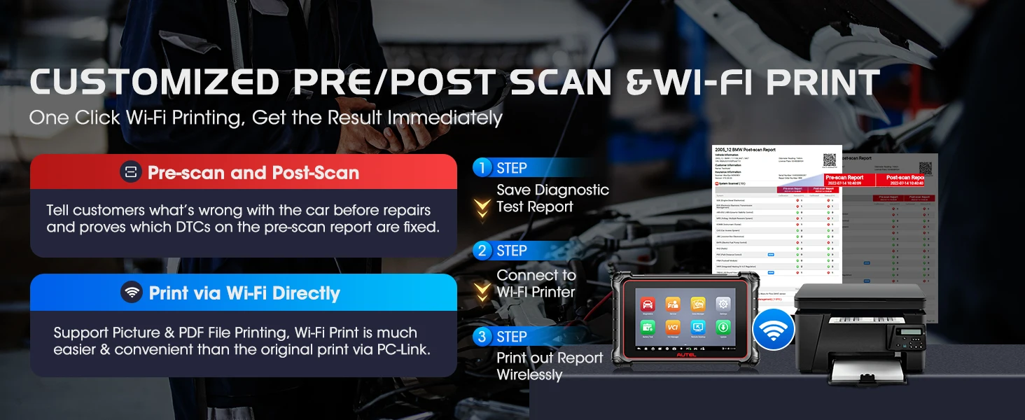 ● WIFI tiskanje (na voljo samo na modelih MS906 PRO in višje), vam omogoča tiskanje diagnostičnih poročil o zdravju avtomobila na katerem koli vmesniku;