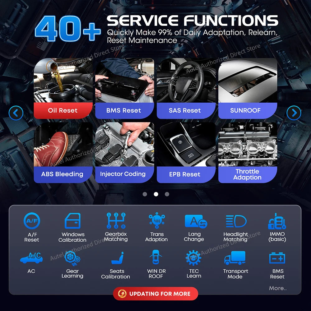 Obstajajo tudi napredne storitve za specializirane modele: Učenje položaja nevtralne prestave, prilagoditev senzorja navora, preverjanje signala, učenje senzorja kota (YRS), učenje položaja sklopke, uravnoteženje moči valjev, usklajevanje komponent, ponastavitev Stop/Start, transportni način, avtomatsko zaklepanje vrat itd.