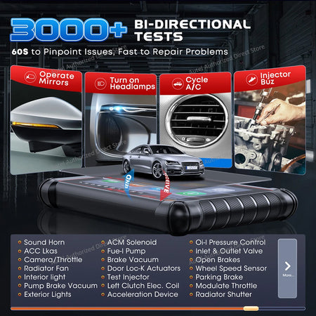 Za razliko od drugih blagovnih znamk orodij za skeniranje s lažnimi oglasi, ki trdijo, da "naredijo vse", v resnici pa imajo le 50+ aktivnih testov za določene modele. Autel MK900-BT profesionalni avtomobilski skener ima vgrajenih 3000+ razpoložljivih aktivnih testov, ki pokrivajo 99% aktuatorjev, ki lahko pošljejo ukaze neposredno za testiranje določenega sistema z vklopom/izklopom funkcij in hitro določijo območja napak, kot so injektor za gorivo, ventilatorji hladilne tekočine, črpalka hladilne tekočine, brisalci vetrobranskega stekla, E.G-R ventil, strešno okno, okna/vrata/strešna okna itd.
