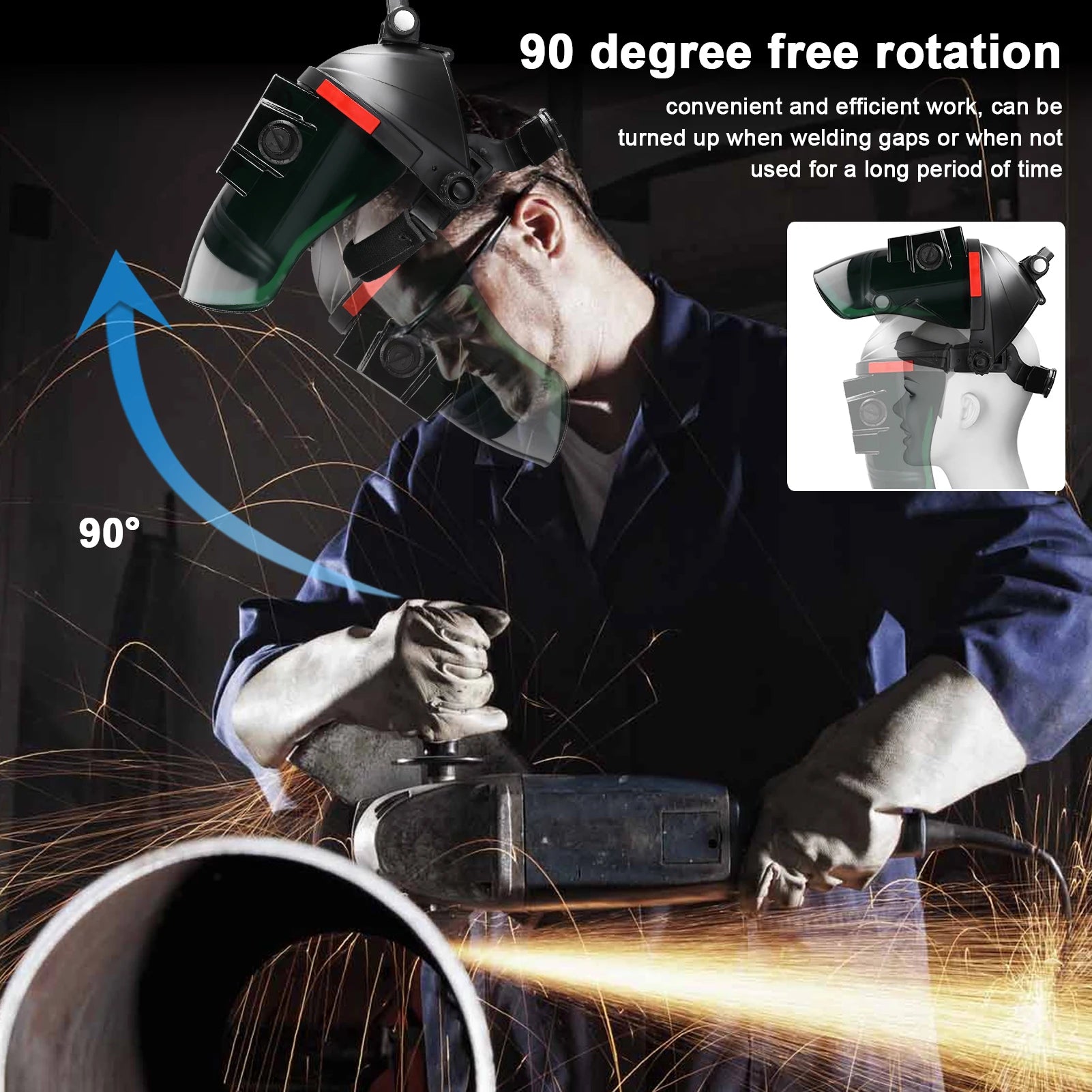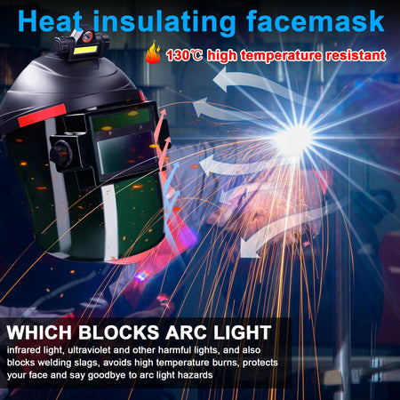 Maska je zasnovana za odpornost proti vročini in udarcem: blokira svetlobo oboka, infrardeče in ultravijolične žarke ter varilne žlindre do 130°C. Zasnova s 180° preklopom vam omogoča, da dvignete masko za hitre vrzeli ali dolge operacije, medtem ko nosljiva zasnova ohranja udoben, zračen razmik od vašega obraza za celodnevno uporabo.