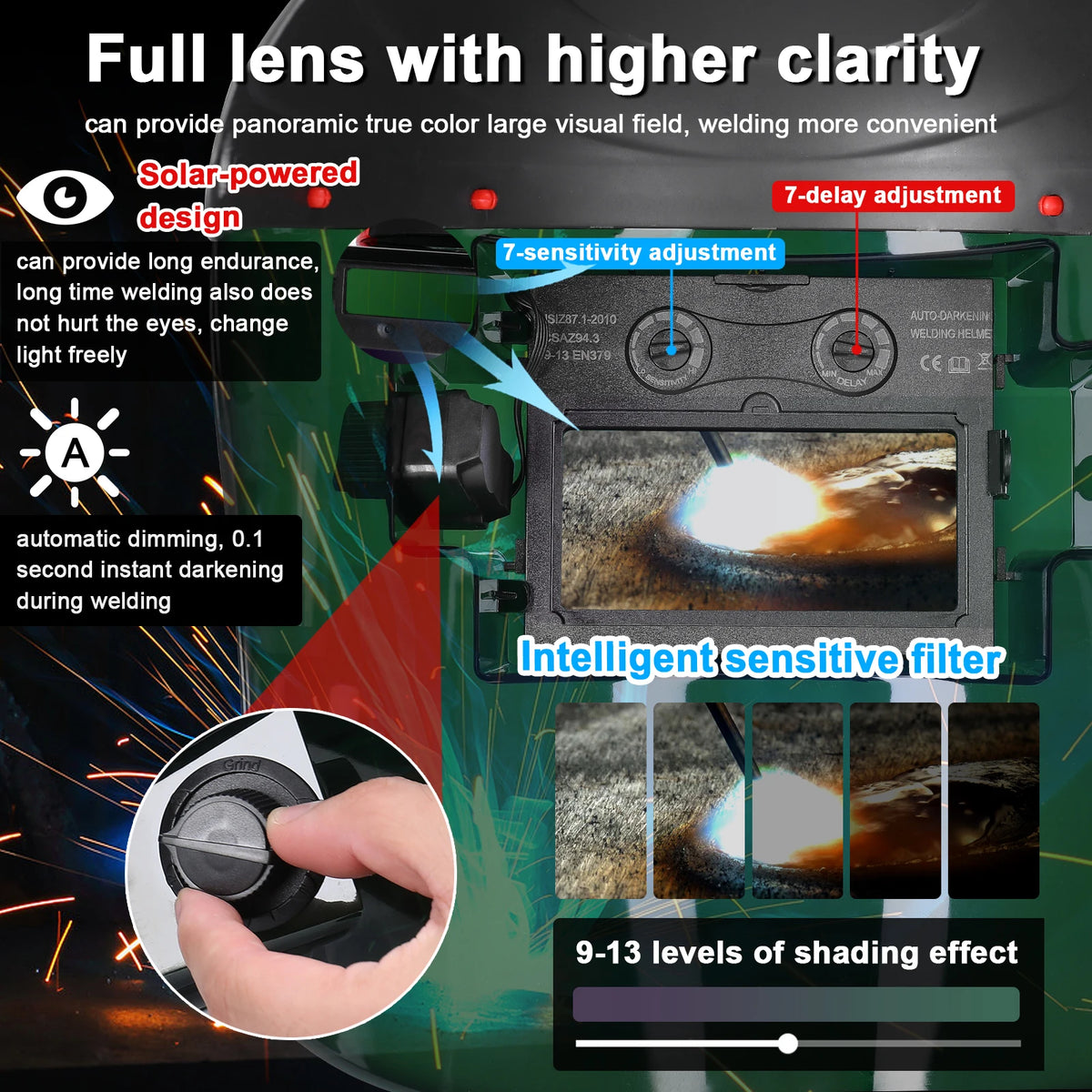 - Prilagodite senco 9–13, skupaj z nastavitvami 7-zamude in 7-občutljivosti, različnim varilnim okoljem za optimalno zaščito in delovanje.