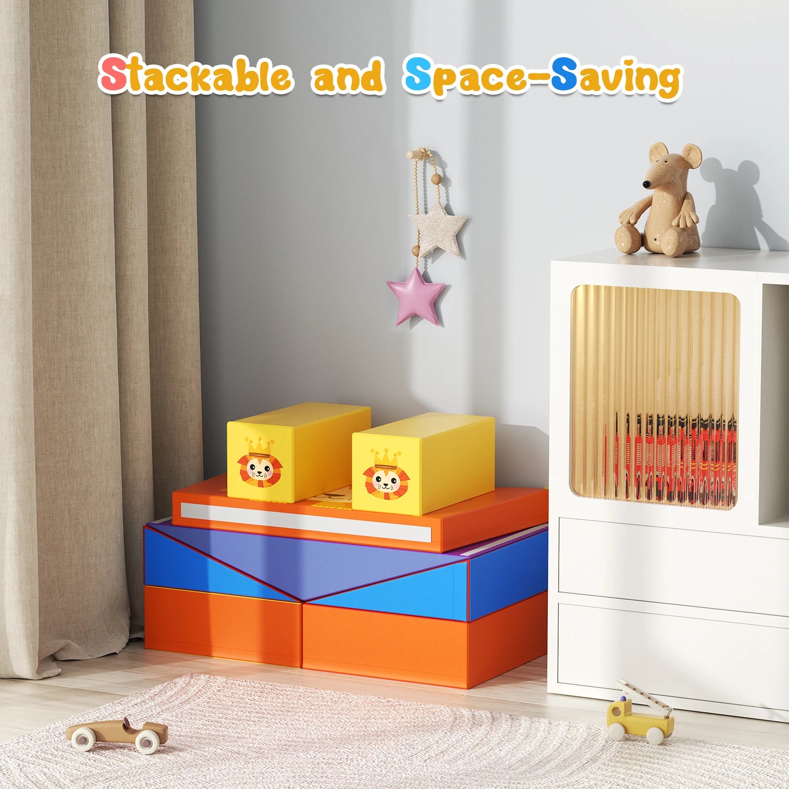 Visokokakovosten polnilo in enostavna zunanjost za čiščenje: Bloki so napolnjeni z visokodensity perlasto bombažno vlakno za mehak, podporen občutek, ki ohranja svojo obliko. Vodoodporna PU usnjena zunanjost se obriše s vlažno krpo, kar ohranja čas igre urejen in pripravljen na naslednjo avanturo.