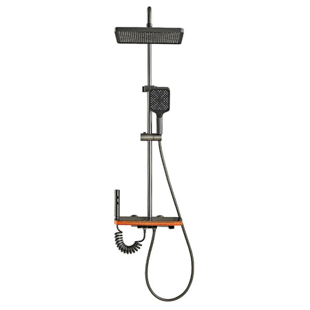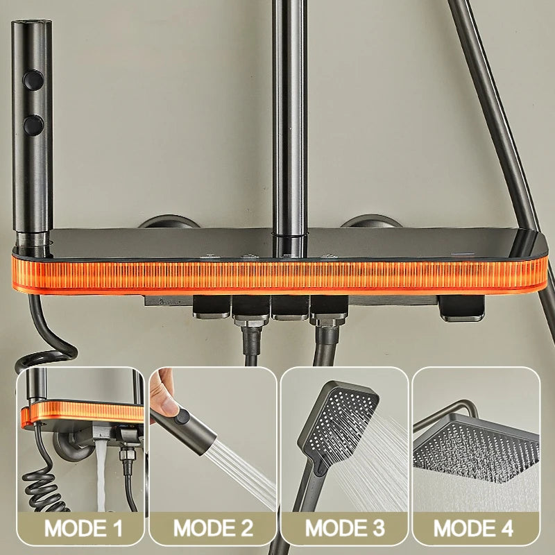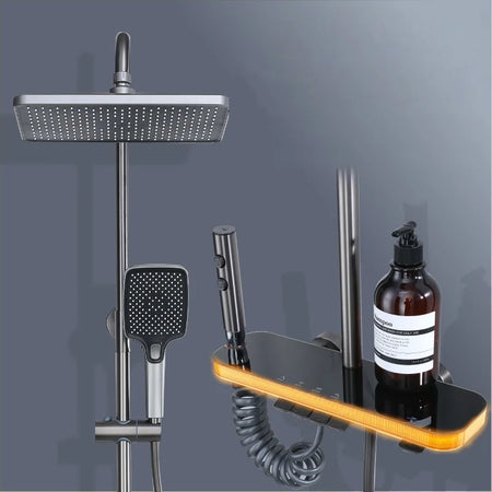 LED svetilka za tuš sistem - Digitalni prikaz temperature — Svetla, moderna tuš glava z vgrajenim LED prikazom temperature in kvadratno kromirano površino za stilno in varno izkušnjo tuširanja.