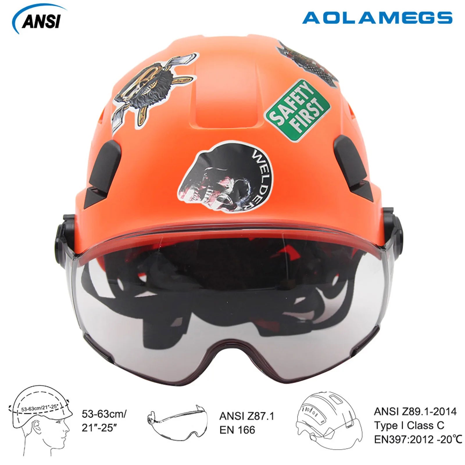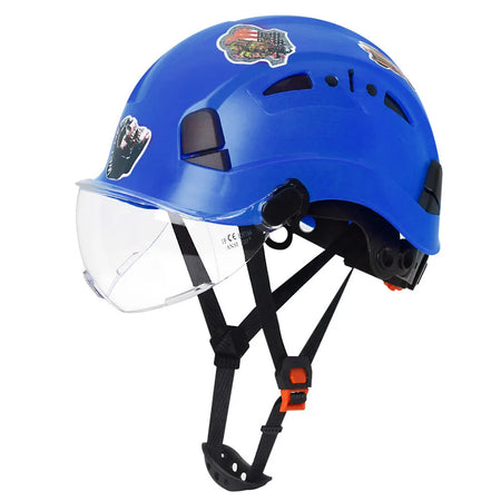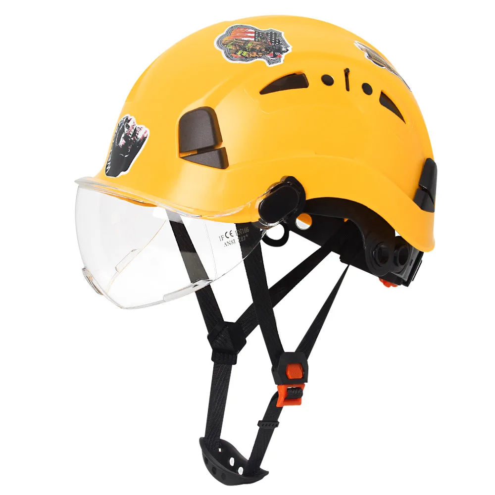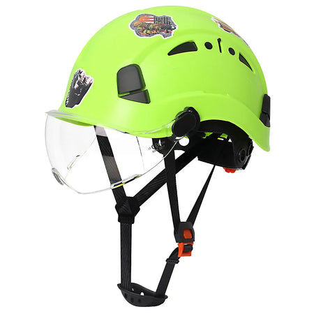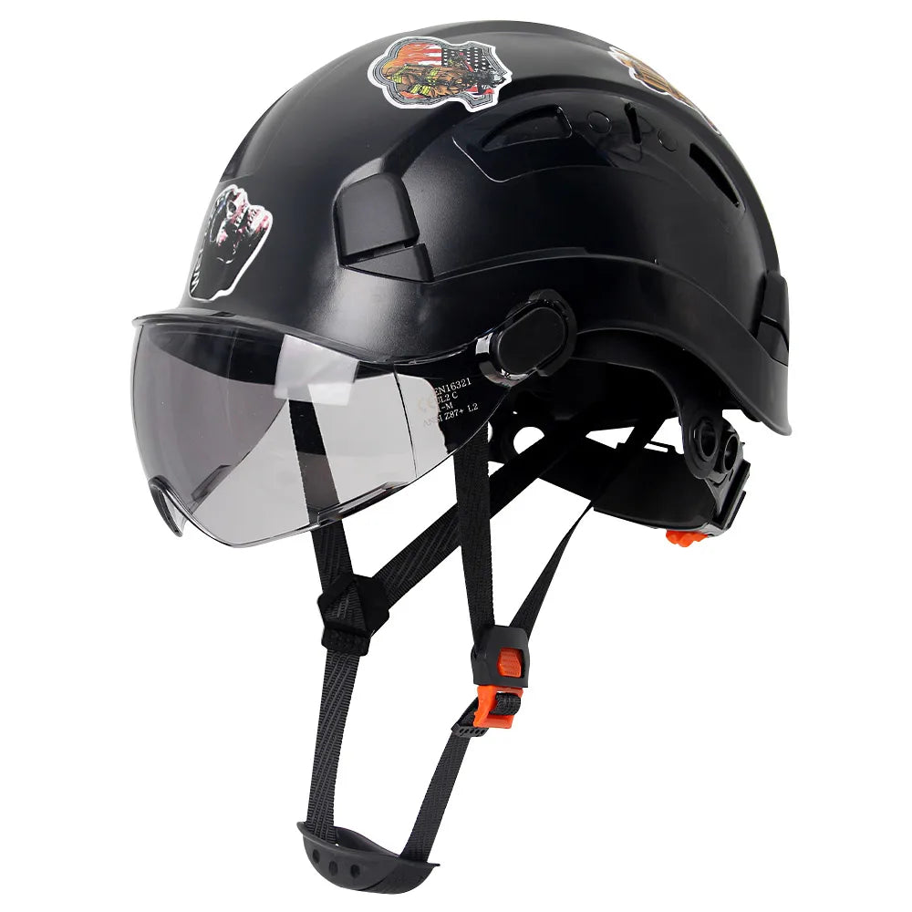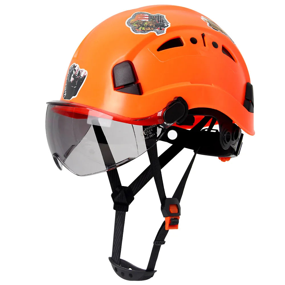 CE zaščitna čelada z očali – Vključuje 50 kosov nalepk — Robustna, visoko udarna zaščitna čelada z integriranimi očali in dodatki, zasnovana za zaščito delavcev na gradbiščih, vzdrževalnih delih in zunanjih projektih. Lahka ABS lupina, tkaninska podloga in Y-oblikovan trak za brado zagotavljajo udobje in varno prileganje.