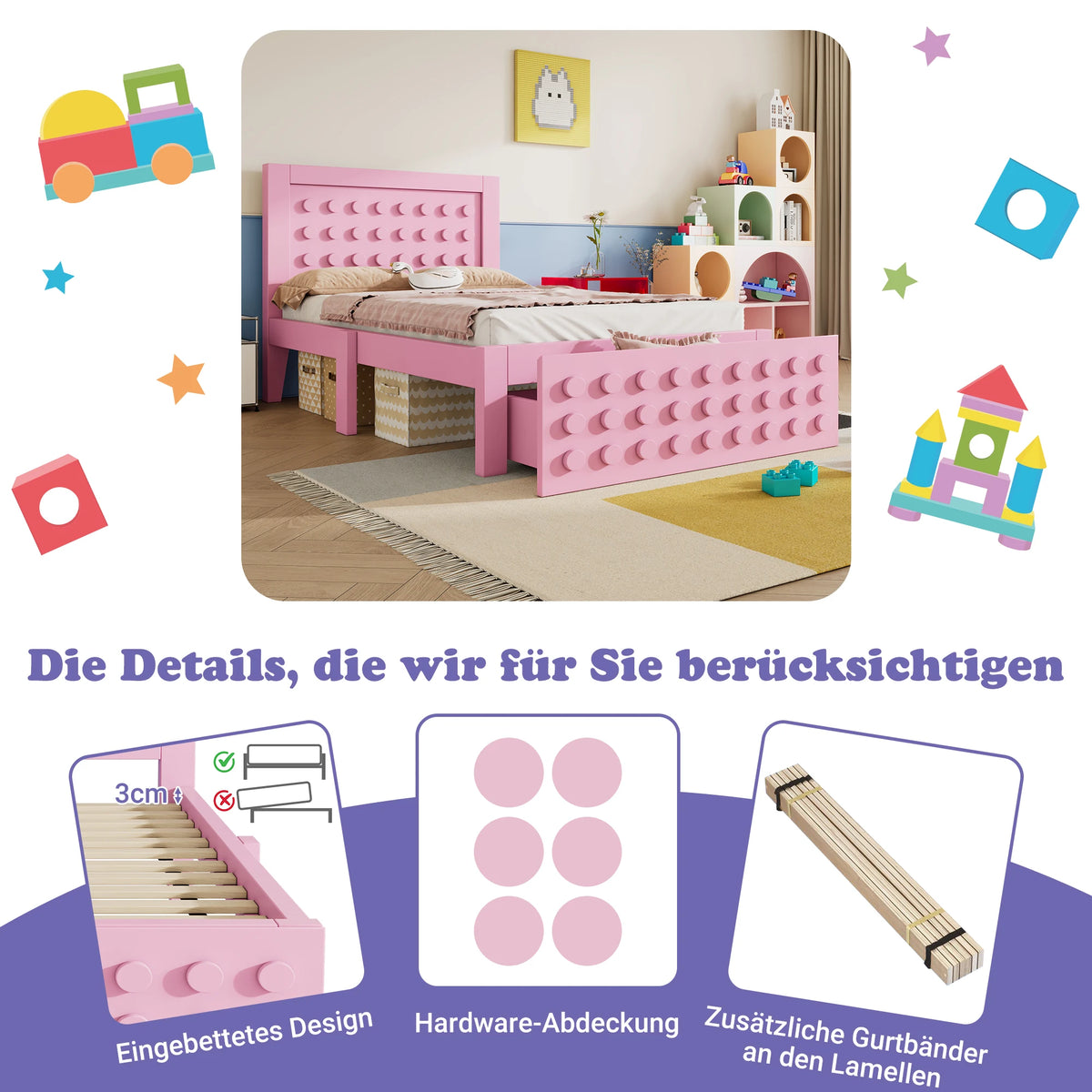 Živahna roza postelja za otroke iz masivnega lesa s predali združuje igriv slog s praktičnim shranjevanjem, kar olajša čas za spanje in pospravljanje. Prilagojena za standardne vzmetnice velikosti 90x200 cm, ta postelja otrokom nudi udoben, osebni prostor, medtem ko vgrajeni predali pomagajo ohranjati igrače, posteljnino in oblačila organizirana. Izdelana iz trpežne kombinacije MDF in masivnega lesa, ponuja trdno podporo in brezčasni videz, ki raste z vašim otrokom. Postelja se pošlje v dveh škatlah in zahteva sestavljanje; box springs niso potrebni, kar poenostavi nastavitev in prihrani prostor v manjših sobah.