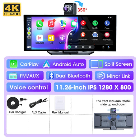 Develuck 11.26 Inch CarPlay 4K Dash Cam with Rotatable Front Camera and Android Auto