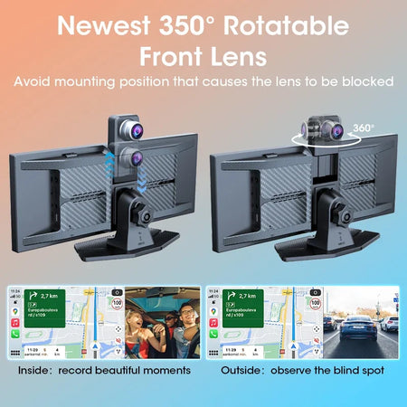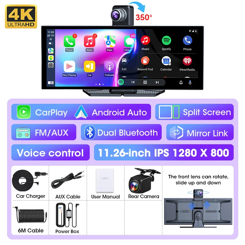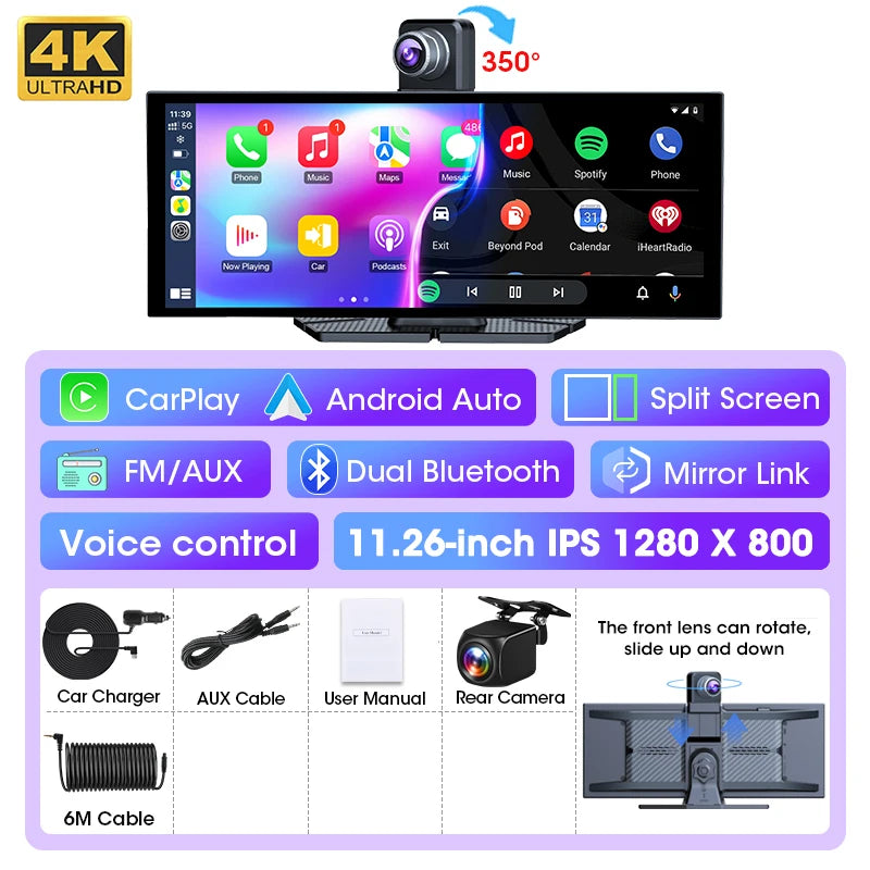 Spoznajte Develuck 11,26-palčni CarPlay Car DVR 4K Dash Cam z 350° rotirajočo sprednjo kamero in povezavo Android Auto. Ta napredna dash kamera deluje tudi kot visoko jasen vozni asistent, ki zagotavlja ultra-ostre 4K sprednje video posnetke, zanesljive 1080P zadnje posnetke in brezhibno integracijo CarPlay/Android Auto. Njegov velik IPS zaslon in vgrajena zasnova ogledala vam nudita jasno, brezkaosno kabinsko izkušnjo, hkrati pa povečujeta varnost, zaščito in udobje na vsakem potovanju.
