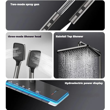 Prednosti: Ta sistem rešuje pogoste izzive pri prenovah z združevanjem nastavljive višine, enostavnega sestavljanja in kompaktnega digitalnega prikaza ambientne svetlobe za izboljšanje vidljivosti in vzdušja. Vzdržljivi komponenti iz nerjavečega jekla in polirana površina odporna na obrabo, medtem ko kombinacija ročnega + stropnega tuša omogoča prilagodljiv pretok vode za čiščenje, izpiranje in sprostitev.