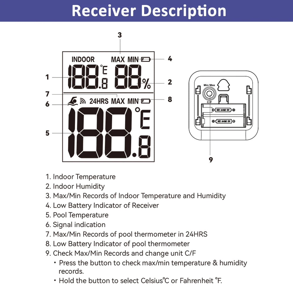 Ključne prednosti vključujejo dolgo in zanesljivo povezavo do 300 ft (90 m) na odprtem prostoru, podporo za Fahrenheit in Celsius ter samodejna posodobitev vsakih 3 minute. Zasnovan za dolgotrajno uporabo, je ta IPX7 vodoodporen termometer idealen za bazene, ribnike, akvarije, otroške kopeli in spa. Meri v širokem razponu (-40°F do 158°F / -40°C do 70°C) in jasno prikazuje trenutno temperaturo vode na digitalnem zaslonu.
