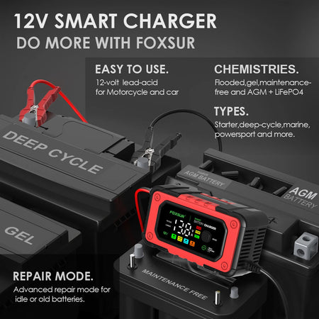 Spoznajte FOXSUR 12V 7A pametni polnilec baterij z več zaščitami, vsestranski spremljevalec za vaše 12V baterije. Zasnovan za motocikle, avtomobile, SUV-je, vodne baterije in širok spekter kemij—vključno s svinčeno-kislinskimi (kalcij, gel, AGM, mokre) in LiFePO4—ta polnilec ohranja baterije zdrave, pripravljene in dolgotrajne. Njegov velik barvni zaslon omogoča takojšnje branje stanja polnjenja, medtem ko inteligentni tiho ventilator zagotavlja učinkovito hlajenje brez hrupa, kar podaljšuje življenjsko dobo polnilca.