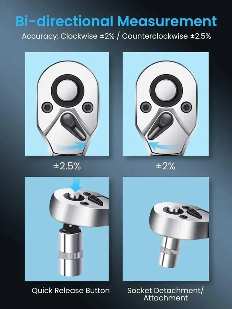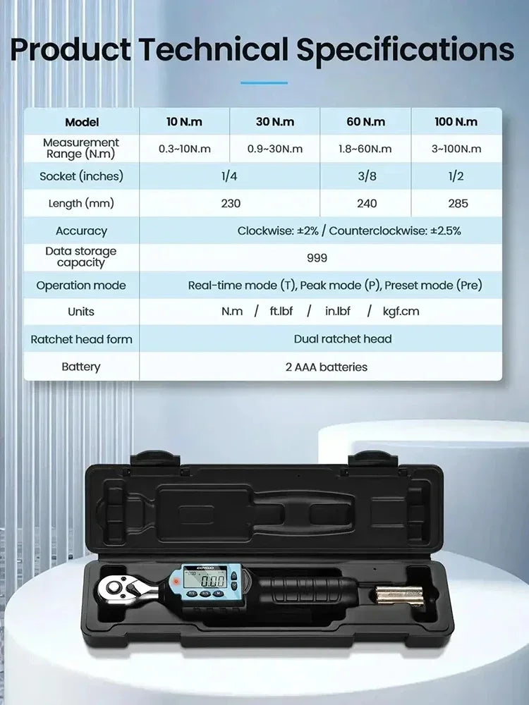 Ta ključ rešuje pogoste težave pri vzdrževanju: natančen moment preprečuje pretesno zategovanje in poškodbe vijakov, medtem ko vas zvočni signal in LED indikator opozorita, ko je dosežen prednastavljen moment. Ponuja tri načine merjenja — Realnočasovni, Vrhunski in Prednastavljen — za prilagodljive delovne tokove in shranjuje do 999 nastavitev momenta za hitre ponovitve. Podpira tako zategovanje v smeri urinega kazalca kot v nasprotni smeri in zagotavlja visoko natančnost: ±2% (v smeri urinega kazalca) in ±2.5% (v nasprotni smeri) v celotnem uporabnem razponu. Enota se samodejno izklopi po 5 minutah, da prihrani življenjsko dobo baterije.
