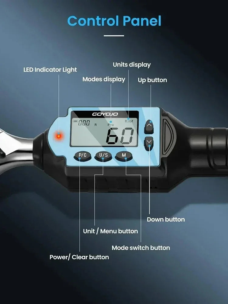 Velik osvetljen digitalni zaslon jasno prikazuje vrednosti momenta v štirih enotah: N.m, kgf.cm, lbf.tf in lbf.in. S premerom 3/8" in največjim momentom 60 Nm (44.25 ft-lb) ta ključ zagotavlja zanesljivo delovanje, kjer je prostor omejen. Tehta približno 819 g (1.81 lb) in je izdelan iz ogljikovega jekla s polirano površino za trajnost.